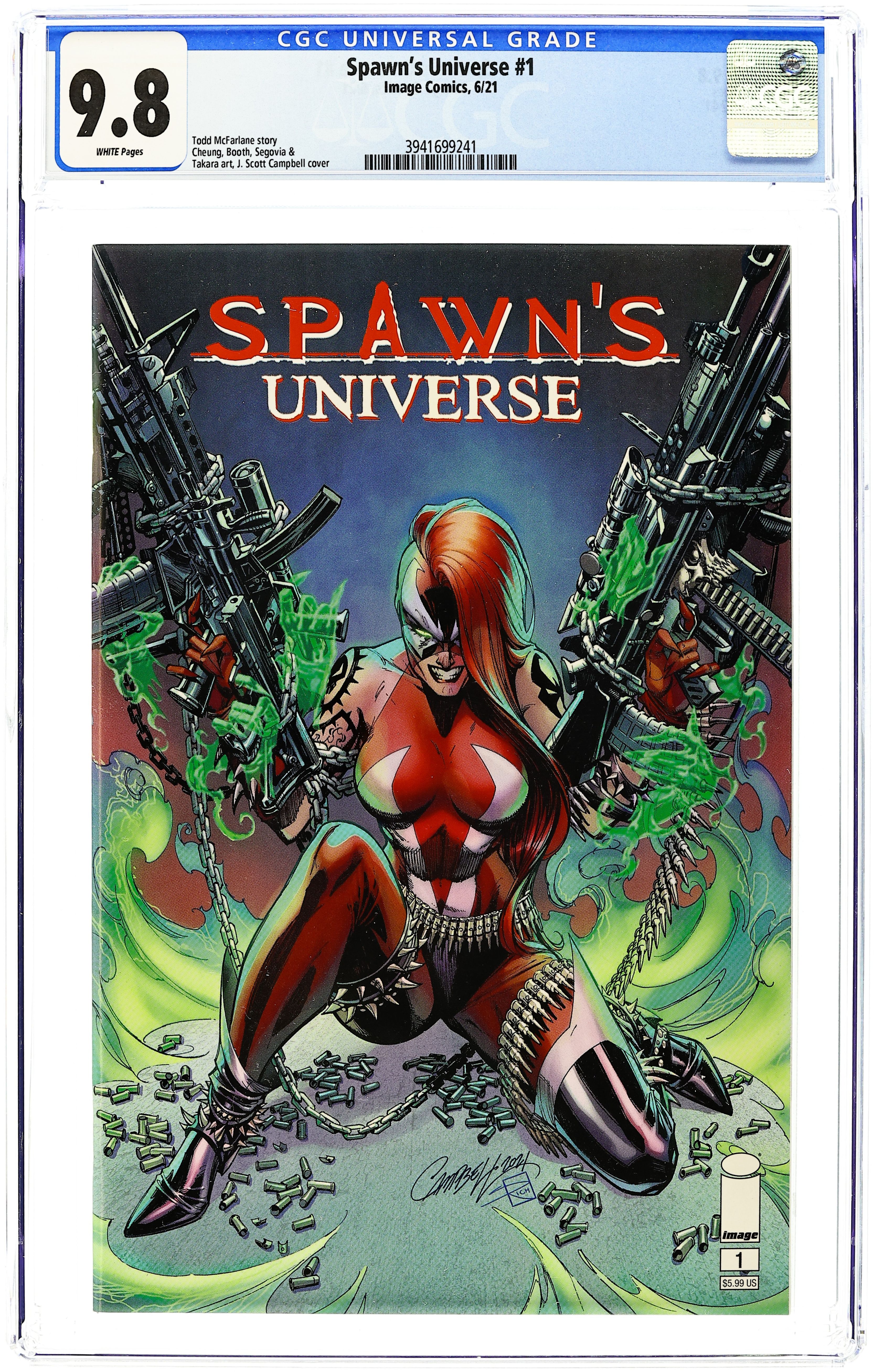 Written by Todd McFarlane. Art by Jim Cheung. Cover by J. Scott Campbell. IT'S HERE: THE OFFICIAL INTRODUCTION TO THE LONG-AWAITED SPAWN'S UNIVERSE! A double-sized issue that begins a storyline so huge that three NEW SPAWN-related monthly titles will spill out from it, including… A new SPAWN title. GUNSLINGER SPAWN monthly. And a new TEAM book bringing a handful of these characters together in their own book. 64 pages, full color. Cover price $5.99. Grade: CGC 9.8 explanation of grade Condition: Used (collectible)