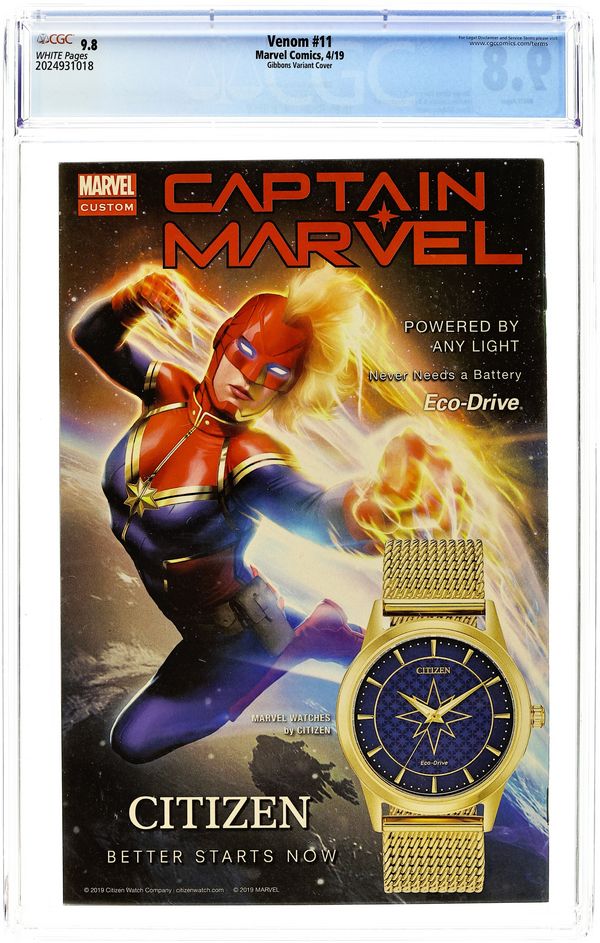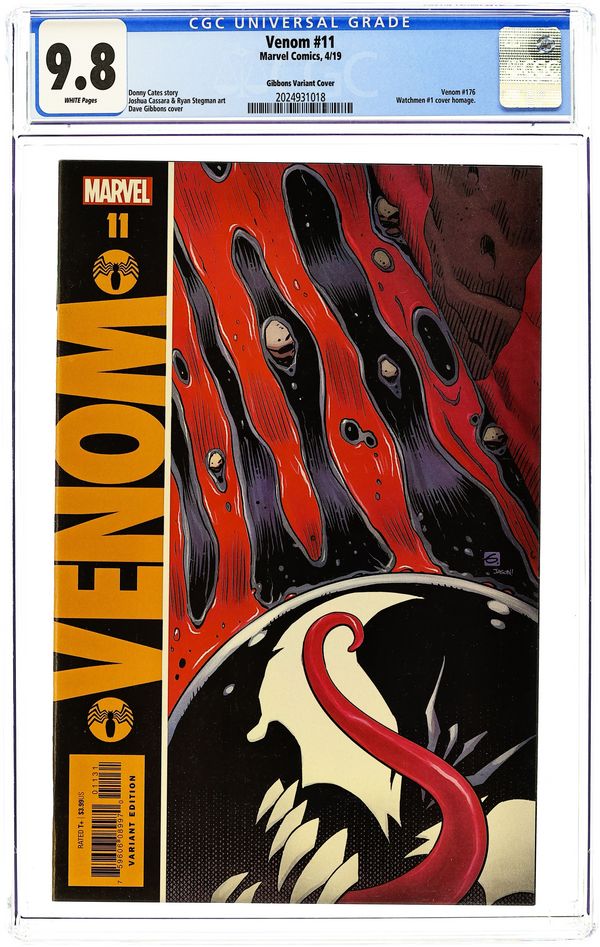 Written by Donny Cates. Art by Ryan Stegman and Joshua Cassara. Cover by Dave Gibbons. The sinister symbiote skulks the streets of San Francisco! With the symbiote silenced and Eddie finding parts of his memory missing, will he be able to find the answers he's looking for in the Golden City? Or will the return to his old stomping grounds reveal secrets better left buried? Rated T+ Cover price $3.99. Grade: CGC 9.8 explanation of grade Condition: Used (collectible)