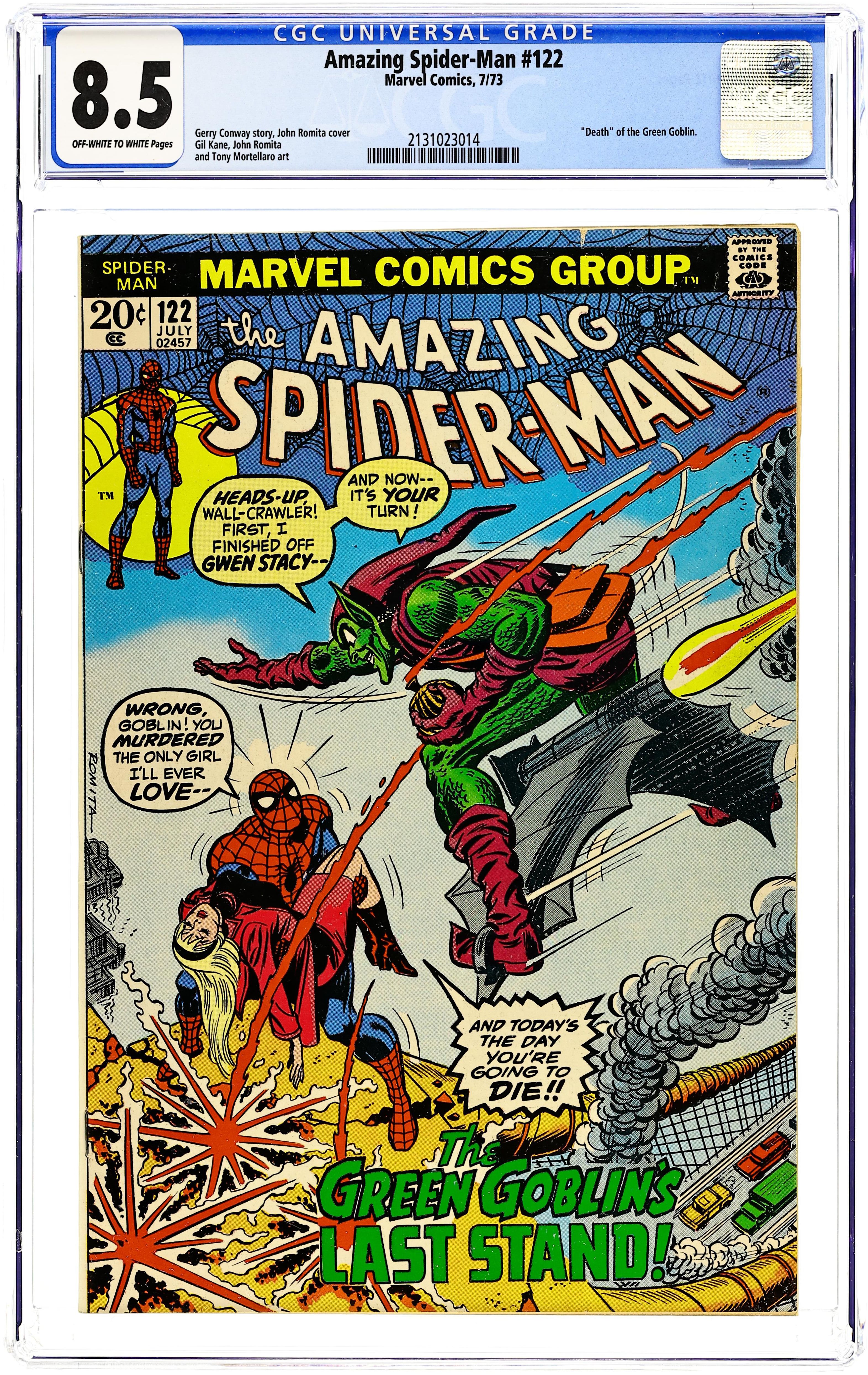Death of the Green Goblin (aka Norman Osborn) in "The Goblin's Last Stand!" Part 2 of 2. Script by Gerry Conway. Pencils by Gil Kane. Inks by John Romita and Tony Mortellaro (backgrounds). Cover by John Romita. In unfathomable fashion atop the Brooklyn Bridge, Gwen Stacy perished at the hands of the Green Goblin. Spider-Man is devastated. And he furiously lashes out at the goblin, but the purple and green-clad killer gets away! However, a while later, the wall-crawler receives a tip from Joe Robertson about Norman Osborn's whereabouts. And in an abandoned and decrepit warehouse, the Amazing Spider-Man and the Green Goblin fight for the final time! At the end of their epic battle, Peter Parker painfully realizes that revenge is bittersweet. The passing of the goblin won't bring back Gwen. He must find a way to move forward with his life. Perhaps Mary Jane Watson will help. Cameo appearances by Harry Osborn and J. Jonah Jameson. (Notes: The stunning death scene of the Green Goblin inspired a similar moment in the2002 Spider-Man movie. This issue was reprinted in Marvel Tales #99 and again in issue 192.) 36 pages. Cover price $0.20. Grade: CGC 8.5 explanation of grade Condition: Used (collectible)