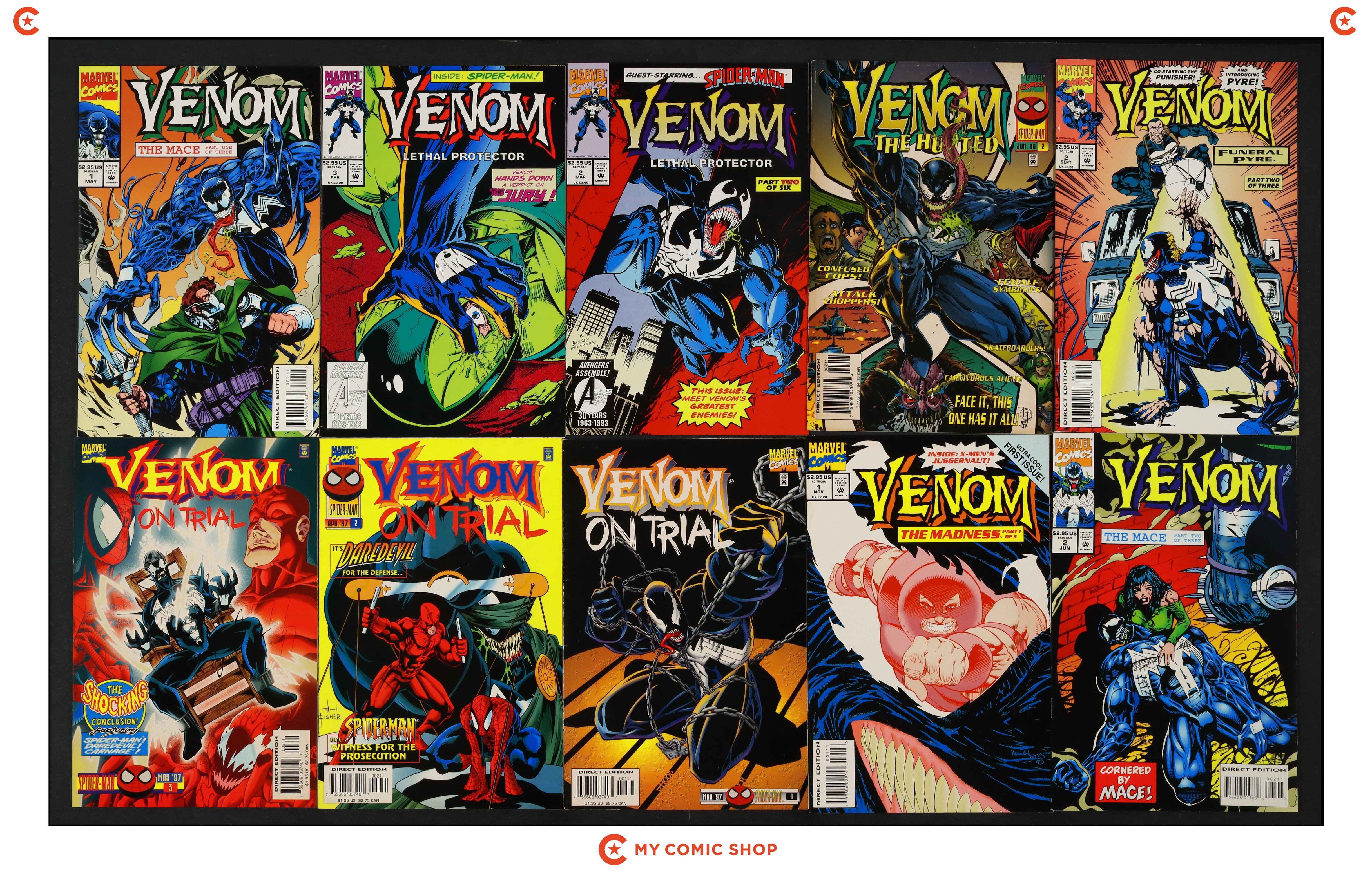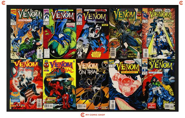 Issue 2 of Venom Funeral Pyre (1993), issue 2 of Venom The Hunted (1996), issues 2D, 3D of Venom Lethal Protector (1993), issues 1, 2 of Venom The Mace (1994), issue 1 of Venom The Madness (1993), issue 1-3 of Venom on Trial (1997). Most will grade in the FN to VF range with 1 of Venom on Trial (1997) grading GD.