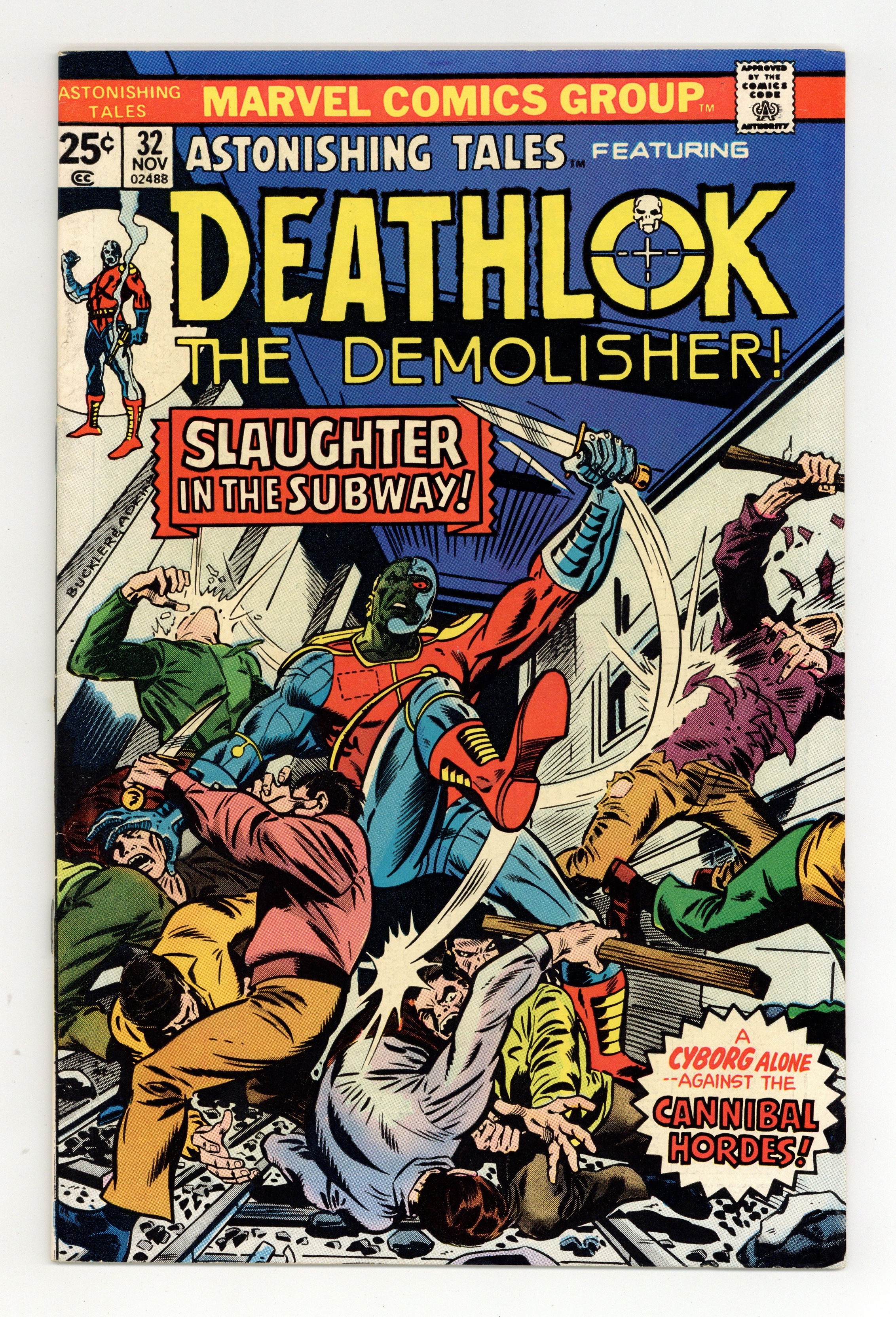 Ends Dec 8 7:33 PM CST Bid History 3 bids Current Bid $6 Your Secret Max Bid If you'd like to bid, please log in or register. Cover pencils by Rich Buckler, inks by Dan Adkins. The Man Who Sold the World!, script by Rich Buckler (Plot, Script pages 1-5) and Bill Mantlo (pages 6-17), pencils by Rich Buckler (Layouts), Keith Pollard, and Bob McLeod , inks by Rich Buckler, Keith Pollard, Bob McLeod, Al Milgrom, and the Marvel Bullpen; Deathlok manages to shoot down the helicopter and trails the mobster who knows which doctor turned him into a cyborg but is unable to get to him before he is killed. MGM's Marvelous Wizard of Oz ad, art by John Romita. Stan Lee's Soapbox. Hostess Fruit Pies ad with Hulk, art by John Romita. Cover price $0.25. Grade: Fine explanation of grade Condition: Used (collectible)