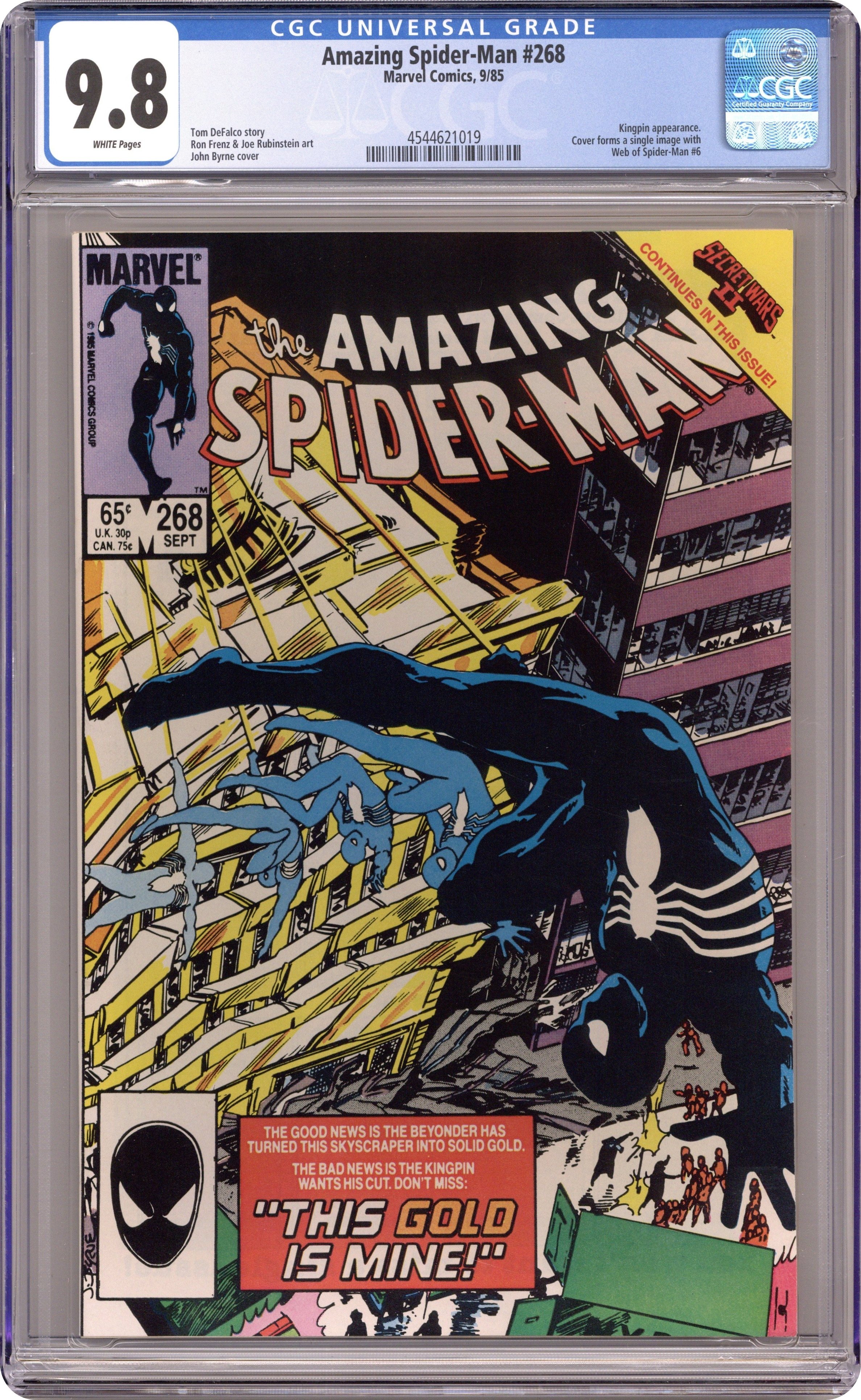 Ended Jul 28 2025 Bid History 11 bids Winning Bid $91 "This Gold is Mine!" Secret Wars II crossover. Part 2 of 2. Script by Tom DeFalco. Pencils by Ron Frenz. Inks by Joe Rubinstein. Cover by John Byrne. Story continues from Web of Spider-Man 6. In incredible fashion the Beyonder turned Power Man and Iron Fist's office building into gold! Everyone will be rich! But hold on...the world's financial markets will collapse with tons of gold dumped into the global economy! So, it's the federal government to the rescue! Under the wall-crawler's watchful eye, the military transports the gold to the west side docks and loads it on cargo ships bound for the Great Puerto Rican trench! However the Kingpin of Crime wants his cut of the gold! So, the Arranger and his henchmen hijack one of the ships! Will Spider-Man make the big city pirates walk the plank? Cameo appearances by J. Jonah Jameson, Ned Leeds, Joe Robertson, and Firelord. (Notes: The cover of this issue can be paired with the cover of Web of Spider-Man 6 to form a complete image of the office building turned into gold. Avengers 258 offers a preview of the web-slinger's upcoming battle vs. Firelord. This issue was reprinted in Marvel Tales 278.) 36 pages. Cover price $0.65. Grade: CGC 9.8 explanation of grade Condition: Used (collectible)