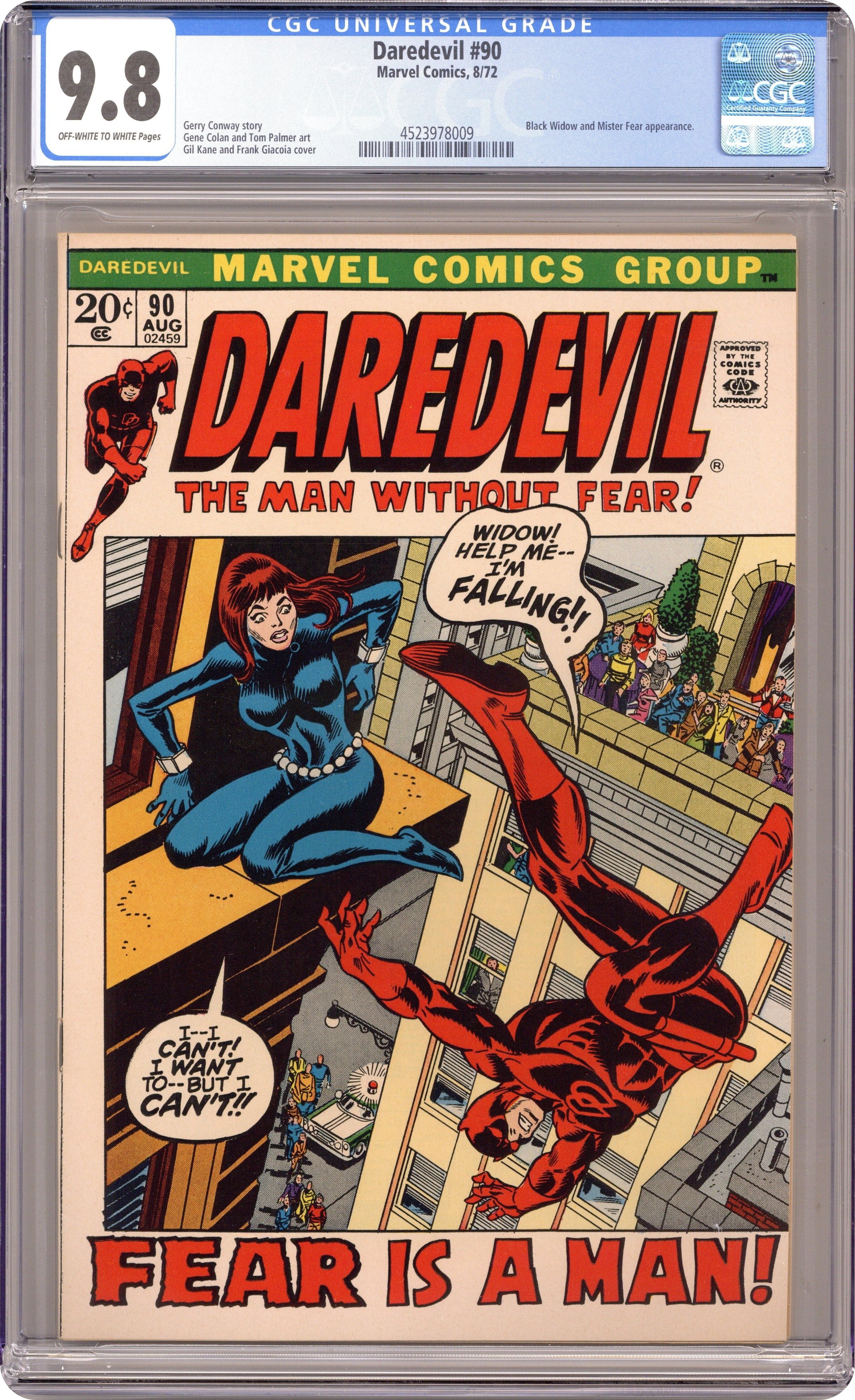 Ended Jul 15 2025 Bid History 13 bids Winning Bid $430 Cover pencils by Gil Kane, inks by Tom Palmer and Frank Giacoia. The Sinister Secret of Project Four!, script by Gerry Conway, pencils by Gene Colan, inks by Tom Palmer; The Black Widow finally fills DD in on the mysterious secrets of Project Four and her history with Danny French; Both Daredevil and the Widow begin to experience intense attacks of debilitating fear. 36 pgs. Cover price $0.20. Cover price $0.20. Grade: CGC 9.8 explanation of grade Condition: Used (collectible)