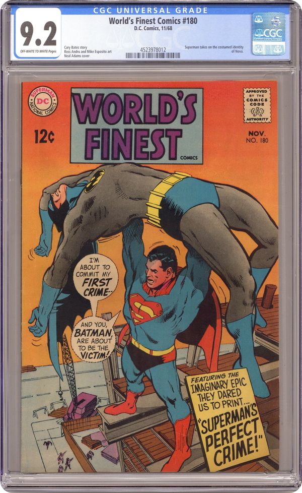 Ended Oct 15 2025 Bid History 14 bids Winning Bid $94 Cover art by Neal Adams. Superman's Perfect Crime! starring Superman and Batman, script by Cary Bates, pencils by Ross Andru, inks by Mike Esposito; without powers, Superman takes on the costumed identity of Nova. The Batmen of All Nations!--Editors' Round Table: Batman, script by Edmond Hamilton, pencils by Sheldon Moldoff, inks by Charles Paris. 36 Pages, Full Color. Cover price $0.12. Grade: CGC 9.2 explanation of grade Condition: Used (collectible)