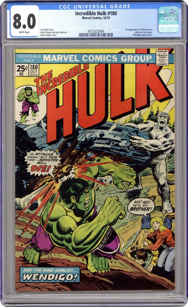 First appearance of Wolverine (cameo last panel). Cover art by Herb Trimpe. And the Wind Howls...Wendigo!, script by Len Wein, pencils by Herb Trimpe, inks by Jack Abel; Hulk is in Canada looking for some peace and quiet when he is mysteriously drawn to a cave inhabited by the sister of the man who became the Wendigo; Marie and Georges plan on transferring the power of the Wendigo to the Hulk, thus restorin Paul Cartier to his normal life; Marie's magic isn't strong enough, however, and just as Wendigo shows up, the Hulk wakes up from his magical slumber and the two battle; The Canadian government gets involved and sends in their own agent to take care of a recent Hulk sighting, the mutant known as Wolverine. Marvel Value Stamp Series A (Cyclops). 36 pgs. $0.25. Cover price $0.25. Grade: CGC 8.0 explanation of grade Condition: Used (collectible)