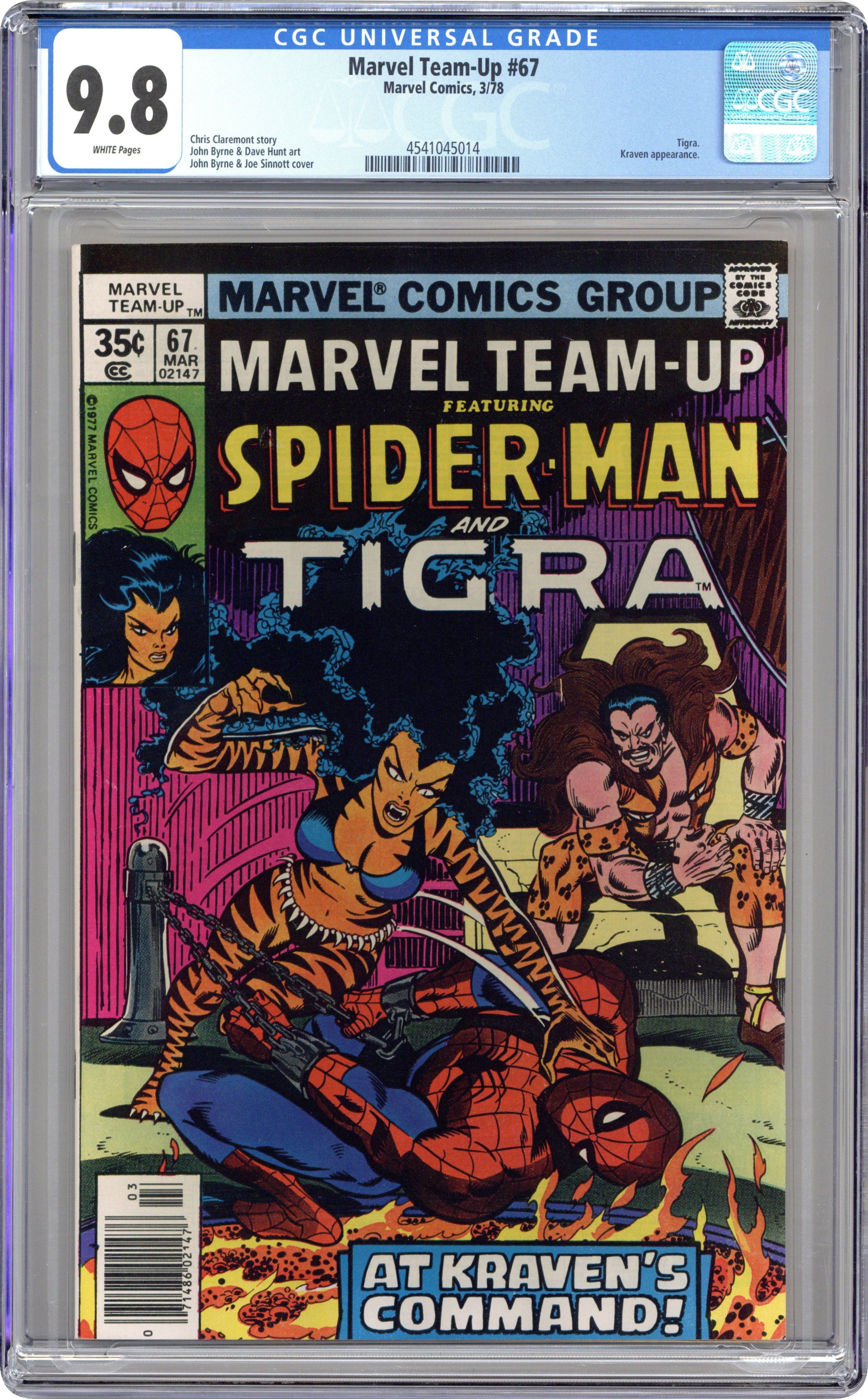 "Tigra, Tigra, Burning Bright!" Guest-starring Spider-Man and Tigra. Script by Chris Claremont. Pencils by John Byrne. Inks by Dave Hunt. Cover by John Byrne and Joe Sinnott. It's a fast moving story as Kraven the Hunter ambushes the web-slinger! Shortly thereafter, the captive wall-crawler is attacked by a mind-controlled Tigra! Can Spider-Man free Tigra from Kraven's clutches? The amazing one needs to move quickly, because a stampede of wild animals is charging in his direction! (Notes: Kraven and Tigra previously battled in Marvel Chillers 4. Kraven appears next in Amazing Spider-Man 209. John Byrne inked page 10. This story was reprinted in Marvel Tales 203.) 36 pages. Cover price $0.35. Grade: CGC 9.8 explanation of grade Condition: Used (collectible)