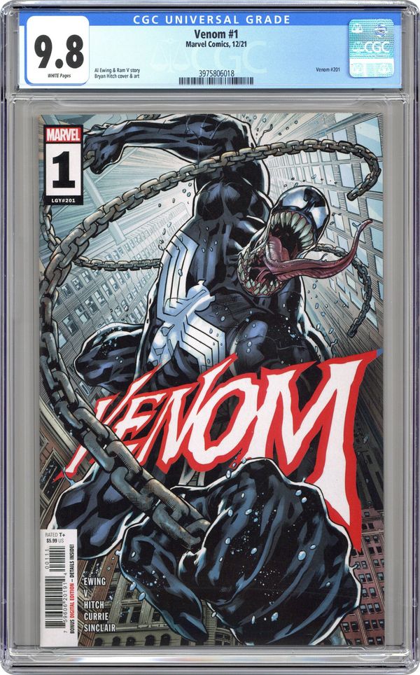 Ended Jul 18 2025 Bid History 11 bids Winning Bid $32 Written by Al Ewing and Ram V. Art and Cover by Bryan Hitch. AN EPIC NEW ERA FOR THE SINISTER SYMBIOTE STARTS HERE! Hot off the heels of VENOM #200 and EXTREME CARNAGE, we're closing out 2021 with one of the most ambitious books in symbiote history - an all-new VENOM from some of comics' greatest talents! Marvel mainstay AL EWING, who himself has just ended a character-redefining run on IMMORTAL HULK, is being joined by RAM V, a horror maestro all his own, to craft a mind-bending and gut-wrenching tale of symbiosis the likes of which the Marvel Universe has never seen! AS IF THAT WASN'T ENOUGH, they've been joined by industry legend BRYAN HITCH, who is leaving IT ALL ON THE PAGE! We haven't led you astray yet, have we? So trust us when we tell you that you have NEVER seen a VENOM like this! 60 pages, full color. RATED T+ Cover price $5.99. Grade: CGC 9.8 explanation of grade Condition: Used (collectible)