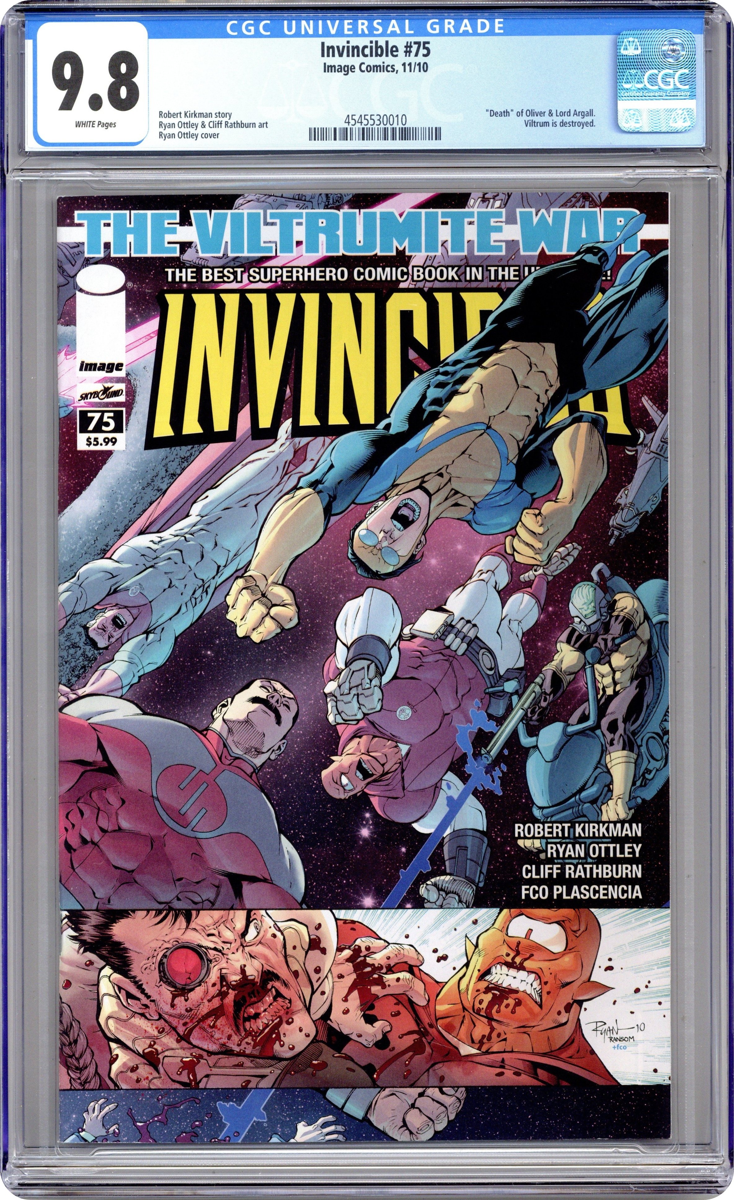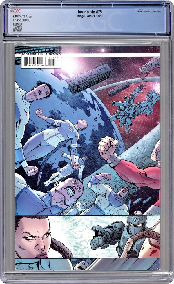 Cover by Ryan Ottley, Ransom Getty and FCO Plascencia. Stories by Robert Kirkman and Aubrey Sitterson. Art by Ryan Ottley, Cory Walker, E. J. Su, Cliff Rathburn, FCO Plascencia, Dave Stewart and Ron Riley. THE VILTRUMITE WAR CONTINUES! Invincible and the Coalition of Planets bring the war to Planet Viltrum! All bets are off as the Coalition forces try to fight their way into the Viltrumite Empire's stronghold. Lives are lost, and a turning point in the war is reached. This issue features a special, over-sized main story by Robert Kirkman, Ryan Ottley, Cliff Rathburn and FCO Plascencia. Plus: Science Dog is back in an all-new back-up story by Robert Kirkman, Cory Walker and Dave Stewart (story is continued from #25 and #50; story concludes in Science Dog Special (2010 Image) #2); Tech Jacket back-up story (part 5 of 8, continues in #77) by Robert Kirkman, Aubrey Sitterson, E. J. Su and Ron Riley; and a pin-up by Ming Doyle. 60 pages, full color. Cover price $5.99. Grade: CGC 9.8 explanation of grade Condition: Used (collectible)