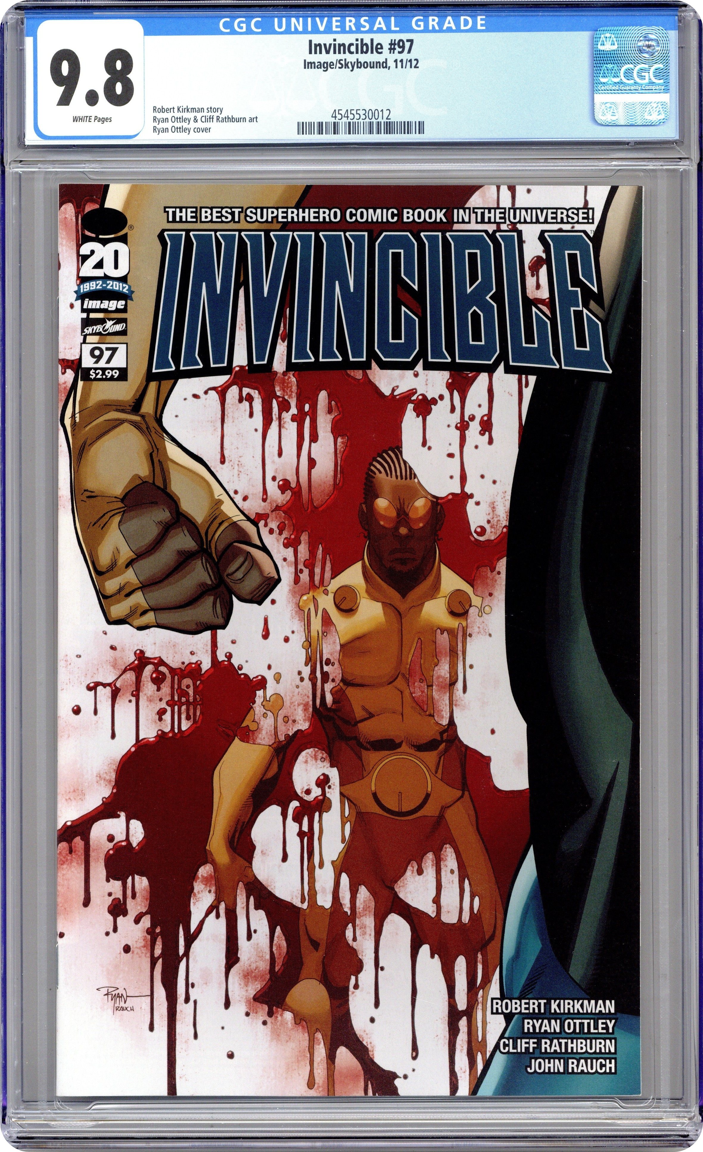 (W) Robert Kirkman (A/CA) Ryan Ottley, John Rauch Finally, at long last: the origin of Zandale Randolph, otherwise known as Invincible. Also in this issue, an update on Mark Grayson, as the stage is set for the MONUMENTAL 100TH ISSUE! Do not miss out! Cover price $2.99. Grade: CGC 9.8 explanation of grade Condition: Used (collectible)
