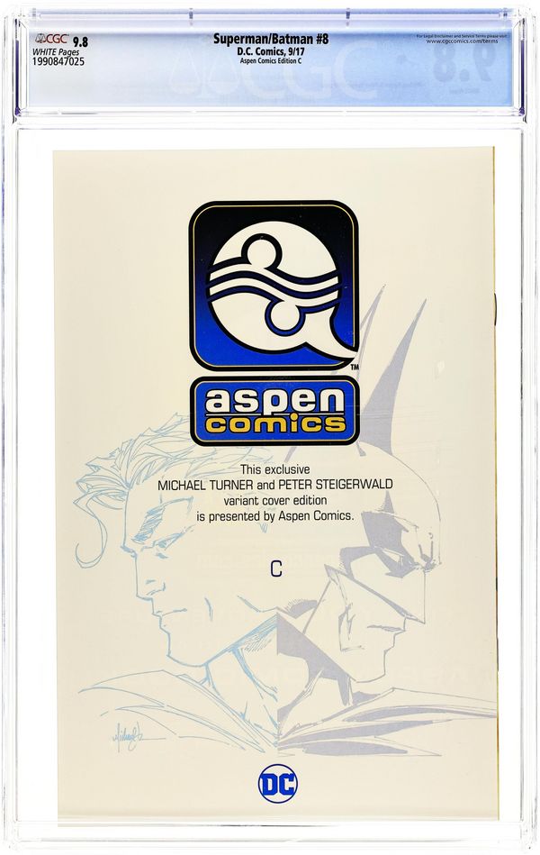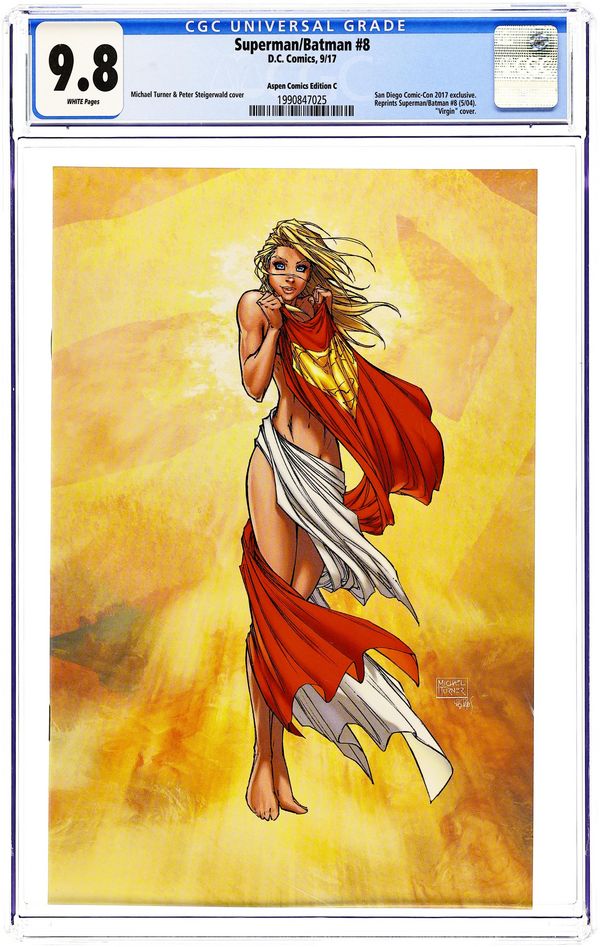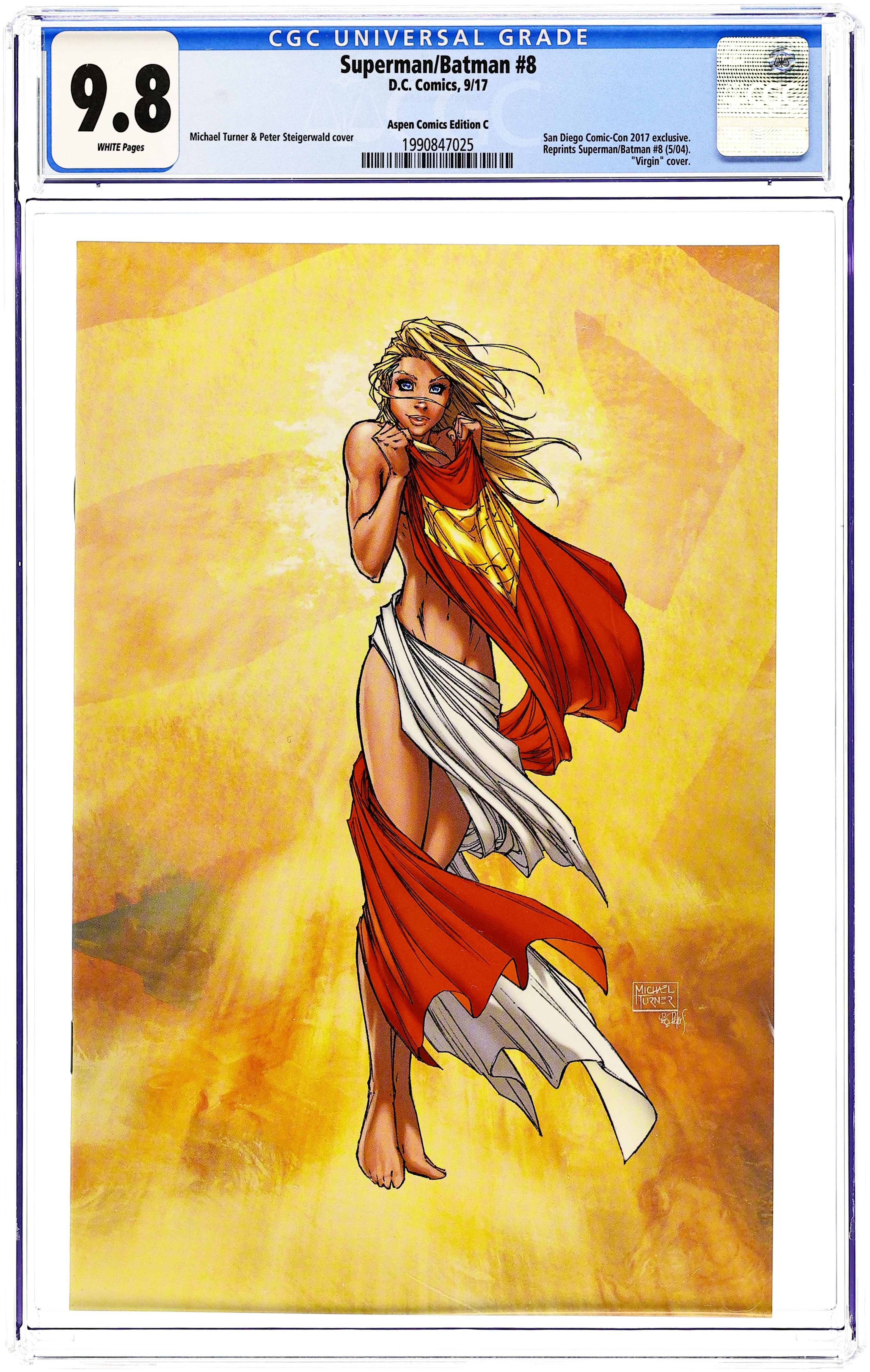 2017 Aspen Comics SDCC virgin variant edition C, reprinted with a new cover using art by the late Michael Turner. Kara Zor-el appearance. WRITTEN BY JEPH LOEB; ART AND COVER BY MICHAEL TURNER An explosive 6-part storyline featuring art by Aspen Studios' Michael Turner begins here! After the cataclysmic events of SUPERMAN/BATMAN #6, Batman discovers something strange and mysterious on the bottom of Gotham Bay...and it looks like a girl. Will she battle on the side of good...or evil? FC, 32 PG. $2.95 Grade: CGC 9.8 explanation of grade Condition: Used (collectible)