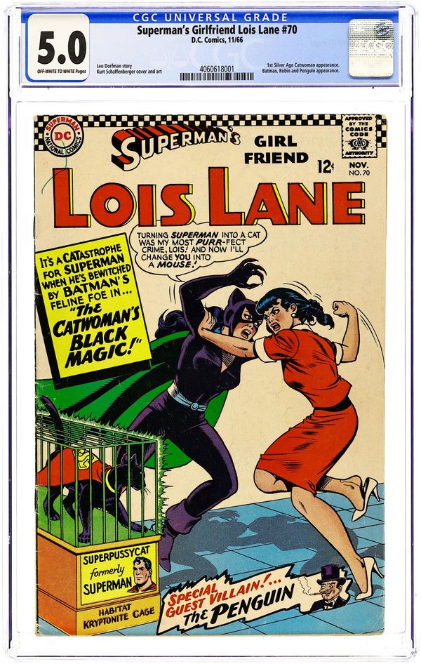 Ended Oct 15 2025 Bid History 15 bids Winning Bid $217 1st Silver Age appearance of Catwoman (see next issue for 2nd appearance & Detective Comics for #369 for 3rd appearance). Cover art by Kurt Schaffenberger. The Catwoman's Black Magic! [Part I], script by Leo Dorfman, art by Kurt Schaffenberger; When the Penguin escapes from prison, Lois tries to track him down but she is kidnapped by Catwoman instead, who hypnotizes her into acting as the villainess's double. House ad for Plastic Man #1. The Catwoman Gets the Bird! (Part II), script by Leo Dorfman, art by Kurt Schaffenberger; The Penguin confronts Lois, thinking she's Catwoman, but Superman, Batman, and Robin show up to take the Penguin back to prison. Superman's Cat-astrophe! (Part III); Catwoman takes Lois's place and tricks Superman into taking her to her lair, where she uses Circe's magic wand to turn him into a cat. Magic Photo Kit featuring Batman and Robin, pencils by Carmine Infantino, inks by Joe Giella. House ad for Justice League of America #48. GI Joe Club ad, art by Irv Novick. 36 Pages, Full Color. Cover price $0.12. Grade: CGC 5.0 explanation of grade Condition: Used (collectible)