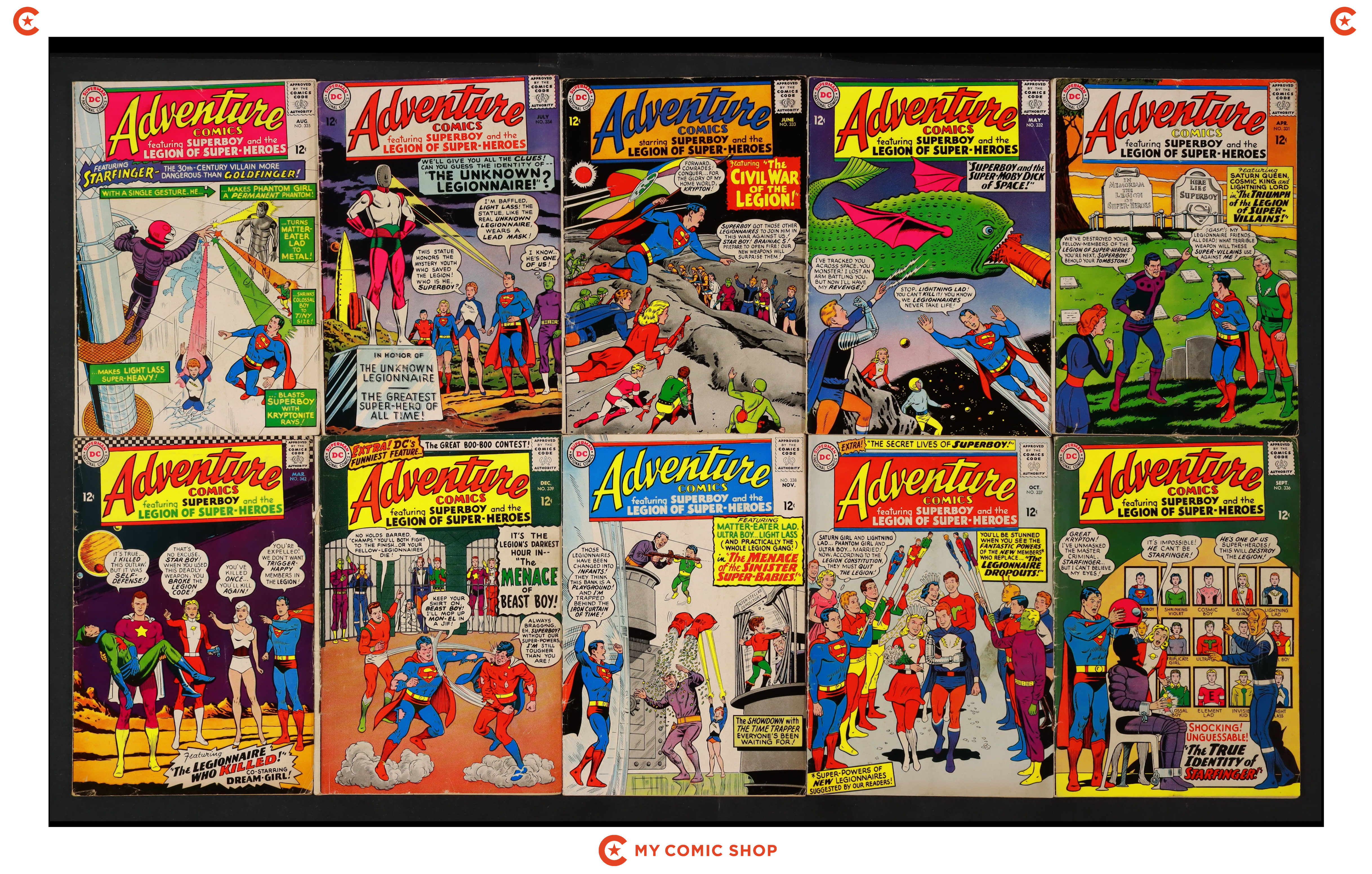 Issues 331-339 and 342 of Adventure Comics (1938 1st Series). Most will grade in the GD/VG to GD range with #333 grading FR (coupon cut, does not affect story or art).