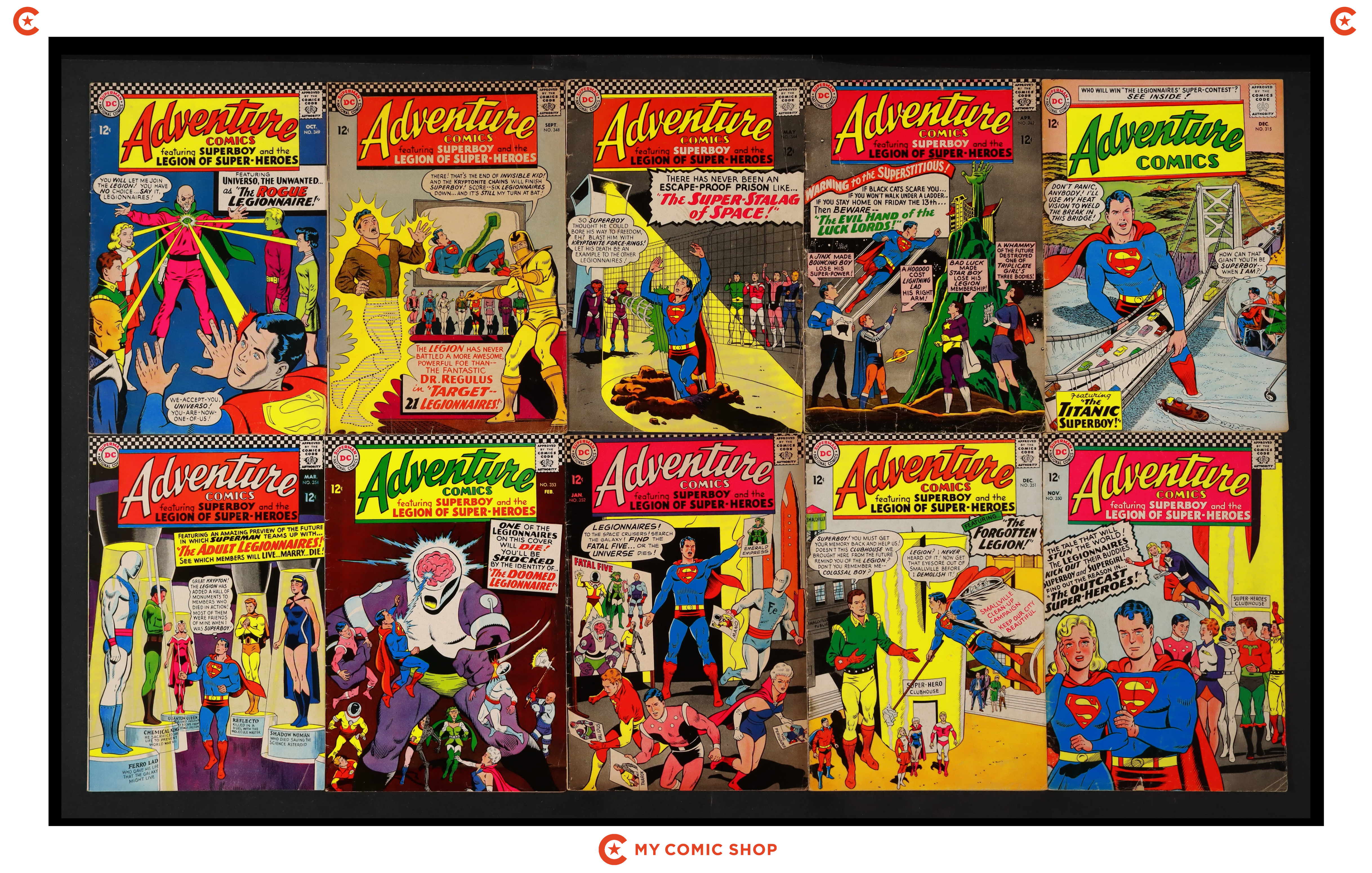 Issues 315, 343, 344, and 348-354 of Adventure Comics (1938 1st Series). Most will grade in the GD range with a couple grading VG.