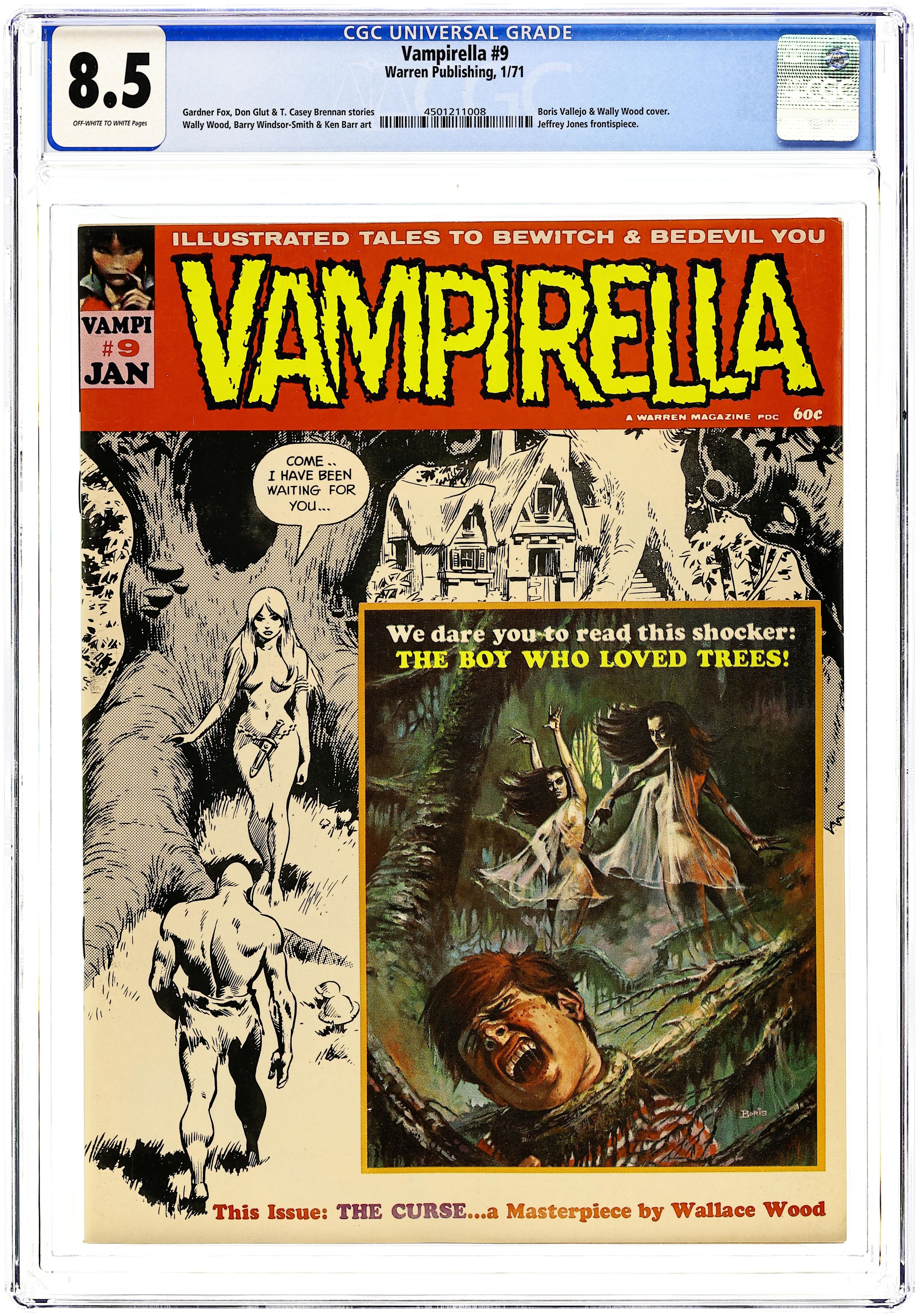 Starts Dec 8 Stories in this issue include: "Vampi's Feary Tales: Lilith"; "Vampirella: The Testing"; "Monster Bait"; "Fate's Cold Finger"; "The Curse"; "Jack the Ripper Strikes Again"; "The Boy who Loved Trees"; and "The Work Orders for the Day." Written by T. Casey Brennan, Chris Fellner, Gardner Fox, Don Glut, Alac Justice, Charles McNaughton, Jr., Barry Smith, and Wally Wood. Art by Jerry Grandenetti, Alac Justice, Gardner Fox, Don Glut, Charles McNaughton, Jr, Barry Smith, Jeff Jones, and Wally Wood. Cover art by Boris Vallejo and Wally Wood. Cover price $0.60. Grade: CGC 8.5 explanation of grade Condition: Used (collectible)