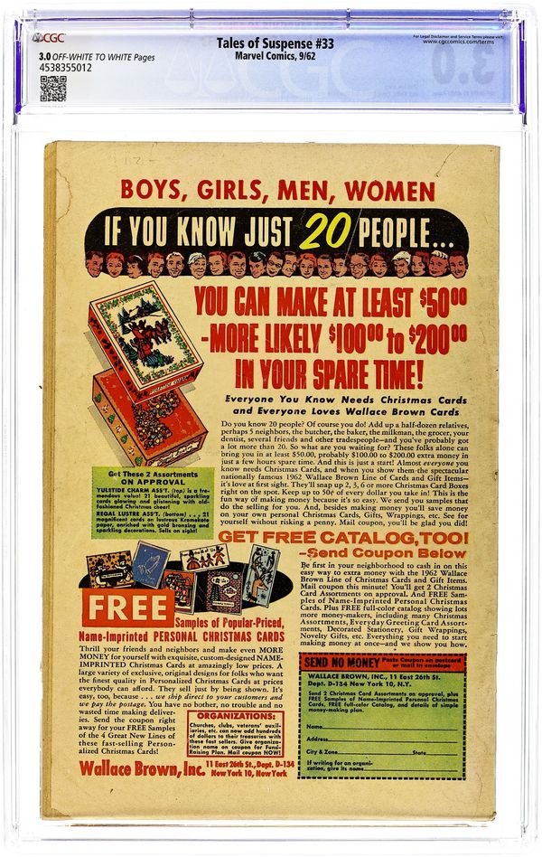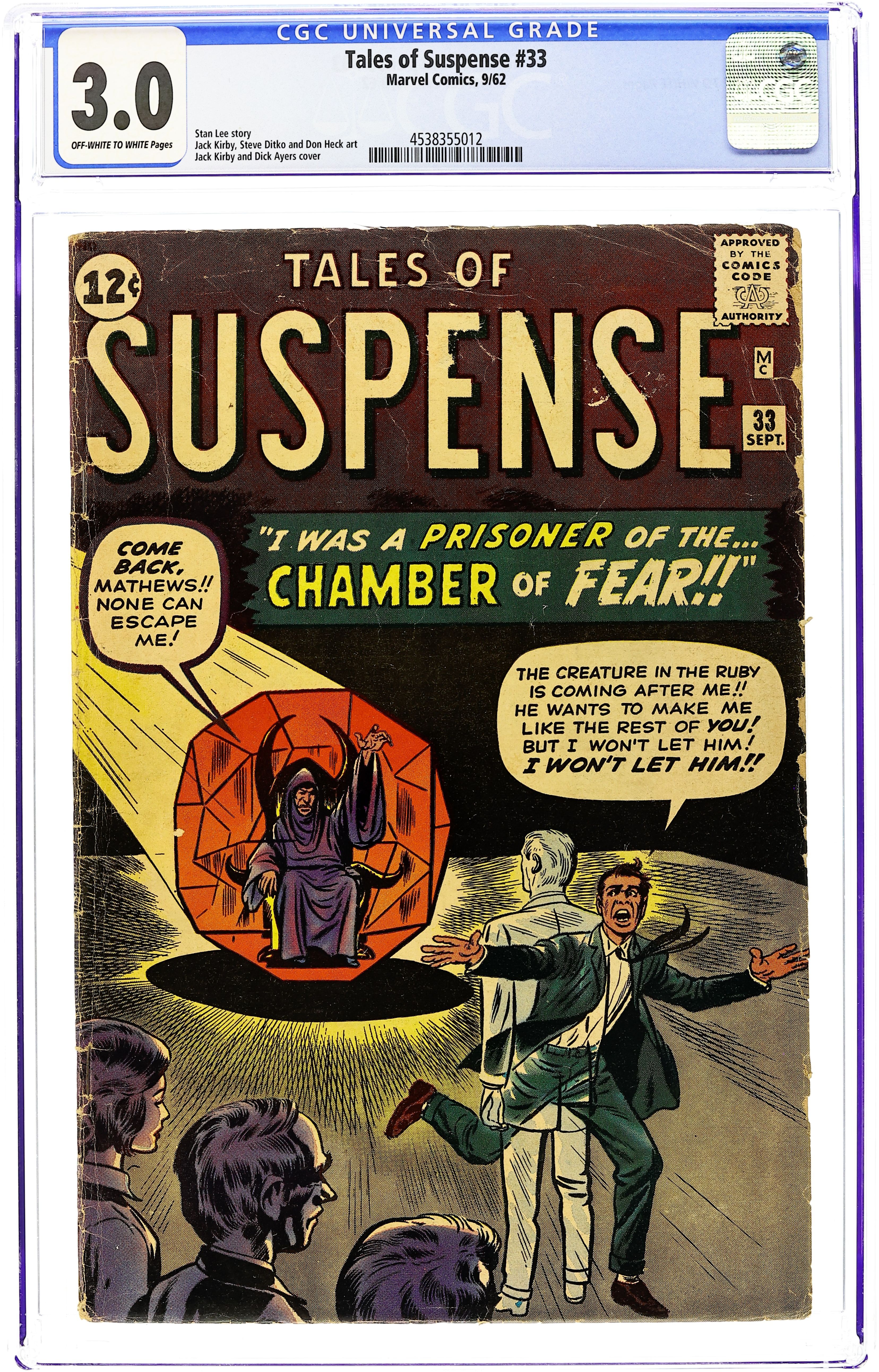 Ended Jun 10 2025 Winning Bid $63 Cover pencils by Jack Kirby, inks by Dick Ayers. "I was Trapped in the Chamber of Fear!", pencils by Jack Kirby, inks by Dick Ayers; A man tries to pitch to Stan Lee the story of a blackmailer who becomes trapped within a mystic ruby as an agent of Fate to direct recently departed souls to their destination; Stan rejects the story as too outlandish even for Tales of Suspense and the man leaves the office. "Bird Talk" text story. "The Mystery of the Tax Collector from Space!", pencils by Jack Kirby, inks by Dick Ayers; A failed actor finds a spaceship with a dead pilot and uses it in an attempt to con the authorities; The ship is actually a decoy, and is retrieved by the aliens to get a human specimen for their zoo. "The Secret of the Mirage," art by Don Heck; A doctor goes to the Middle East to treat the local people; He is attacked by bandits for curing the local sheikh, and chased into a desert mirage, which takes him to a utopian world. "Where Is the Wommelly?", script by Stan Lee (signed), art by Steve Ditko; An alien armada attempts to conquer Earth, but is driven off; One of the ships is damaged and forced to land on Earth, its pilot an outcast forever on the planet; The military is convinced they will capture the alien at any moment since it must be of monstrous appearance. 36 pages, full color. Cover price $0.12. Grade: CGC 3.0 explanation of grade Condition: Used (collectible)