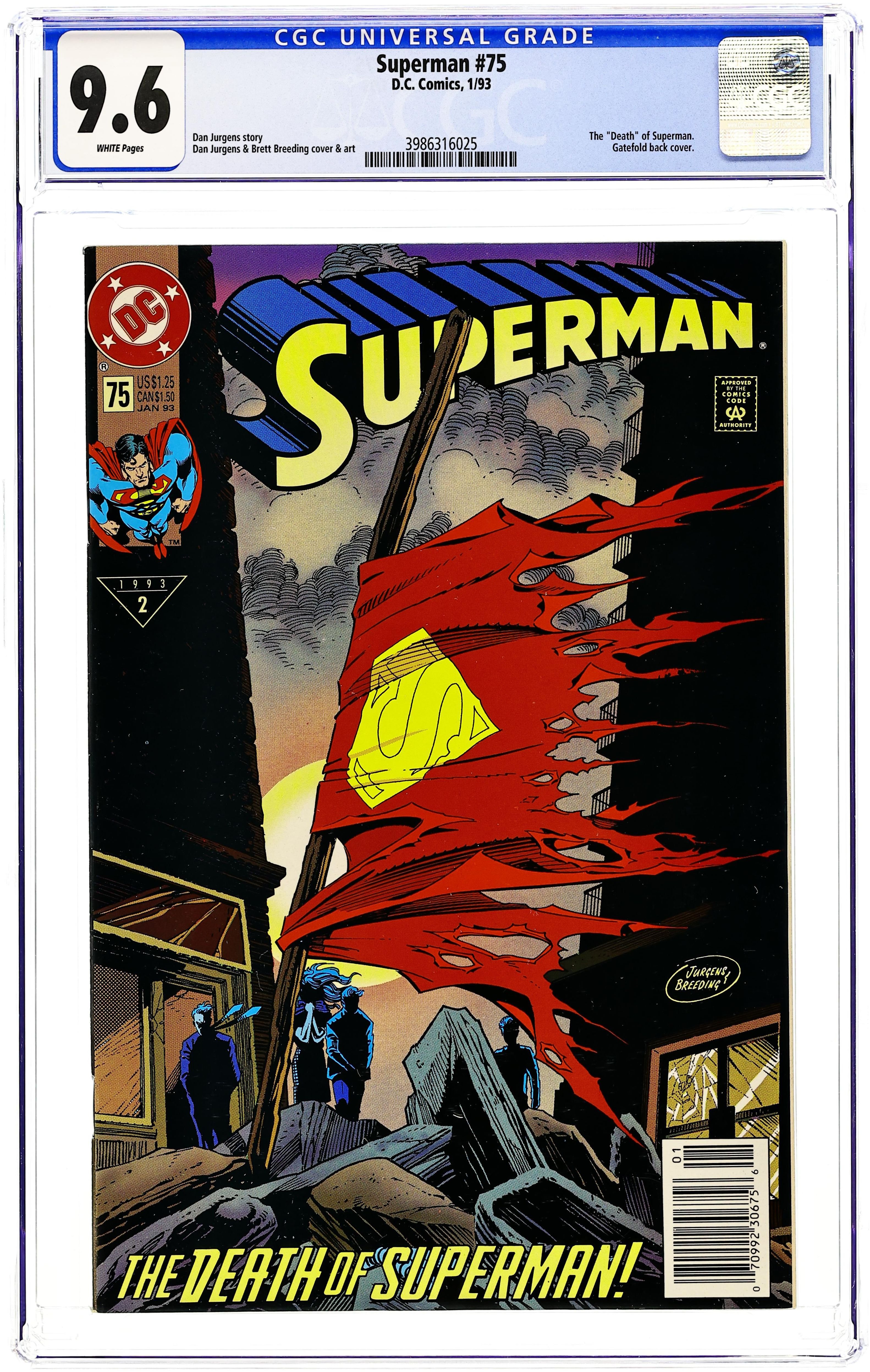 1st printing. Doomsday! Part 7 of 7. "Doomsday!" Story by Dan Jurgens. Art by Dan Jurgens and Brett Breeding. Here it is, the issue that rocked the DC Universe. An unstoppable force named Doomsday crash landed on Earth and has cut a swath of death and destruction across the country, all the way to Metropolis. Even the Justice League, the world's premiere super-team, was powerless before this creature's might. Now one man stands defiantly in Doomsday's way and vows that the creature's insanity stops here. Superman fights his strongest opponent to the death in the streets of Metropolis. NOTE: The event of "The Death of Superman" was so huge that it was reported on by the national media. - Odinson, Lonestar Comics Archivist Cover price $1.25. Grade: CGC 9.6 explanation of grade Condition: Used (collectible)