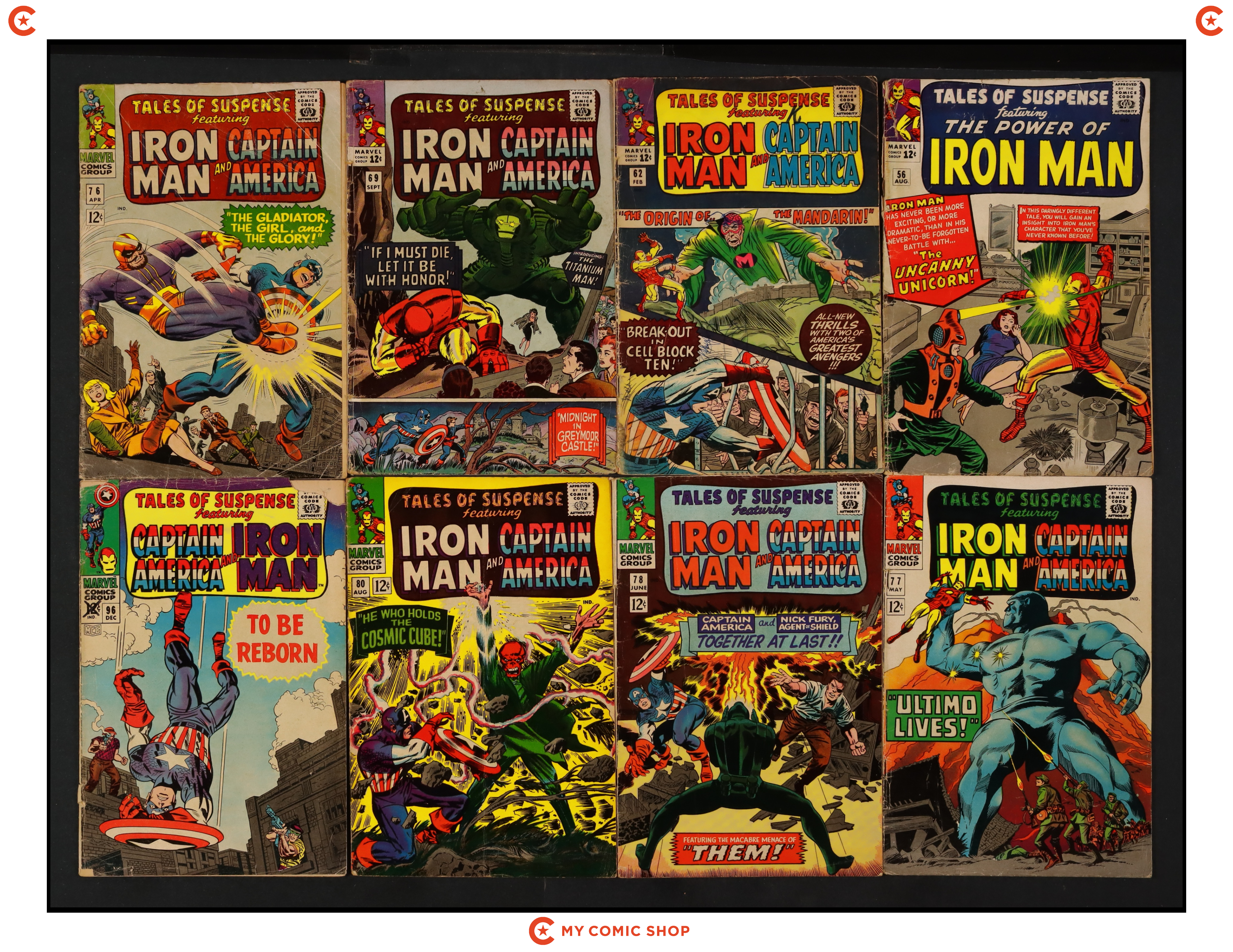 Issues 56, 62, 69, 76-78, 80, 96 of Tales of Suspense (1959). Most will grade in the FR to GD range.