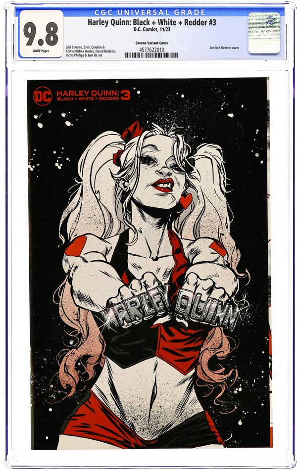 Ended Jul 7 2025 Winning Bid $154 Limited 1 for 25 Retailer Incentive Variant Cover. Written by Gail Simone, Aditya Bidikar, Chris Condon. Art by David Baldeon, Juni Ba, Jacob Phillips. Cover by Sanford Greene. Three all-new short tales of Gotham's most unpredictable antihero in only black, white, and red ink! In this issue: Superstar writer Gail Simone returns to DC with a hilarious story sending Harley Quinn to Rann, with Domino artist David Baldeon riding along on the zeta-beam! Monkey Meat and Teenage Mutant Ninja Turtles breakout Juni Ba teams up with writer Aditya Bidikar to give Harley the perfect cure for the breakup blues: a kitten. Plus, That Texas Blood hitmakers Chris Condon and Jacob Phillips tell a tale of twisted fate where Harleen Quinzel never fell for The Joker! 40 pages, CP/B&W. Rated T+ Cover price $4.99. Grade: CGC 9.8 explanation of grade Condition: Used (collectible)