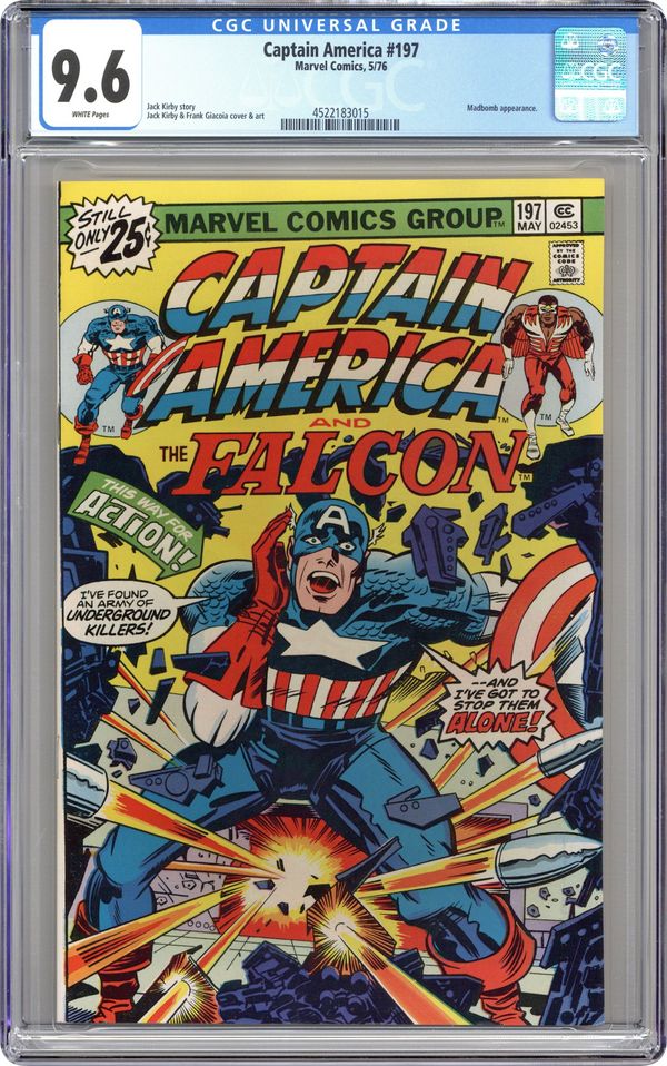 "The Rocks Are Burning!" Part 5 of 8. Script by Jack Kirby. Pencils by Jack Kirby. Inks by Frank Giacoia. Cover by Jack Kirby and John Verpoorten. The kill-derby rages on in the Royalist Forces of America's hidden base! While the Falcon fights to stay alive amidst the free-for-all, Cap struggles with the blue team fighter who has his shield! Just as the Sentinel of Liberty regains possession of his shield, he hears loud explosions! And the RFA's secret headquarters begins to shake! At last thearmy has found the underground complex. Pandemonium erupts inside as everyone dashes for the base's exits including Cheer Chadwick and the Elites and Captain America and the Falcon! Who is getting out alive? And who is not? Oh, and where is the Madbomb? Cameo appearances by Dr. Hesperus Chadwick and General Argyle Fist. (Notes: Cheer Chadwick returns years later in Thunderbolts #31. The letters page includes a letter from comics editor Ralph Macchio. The letters page also contains Marvel Value Stamp series B #78 (Conan). There exists a 30-cent cover price variant for this issue.) 36 pages. Cover price $0.25. Grade: CGC 9.6 explanation of grade Condition: Used (collectible)