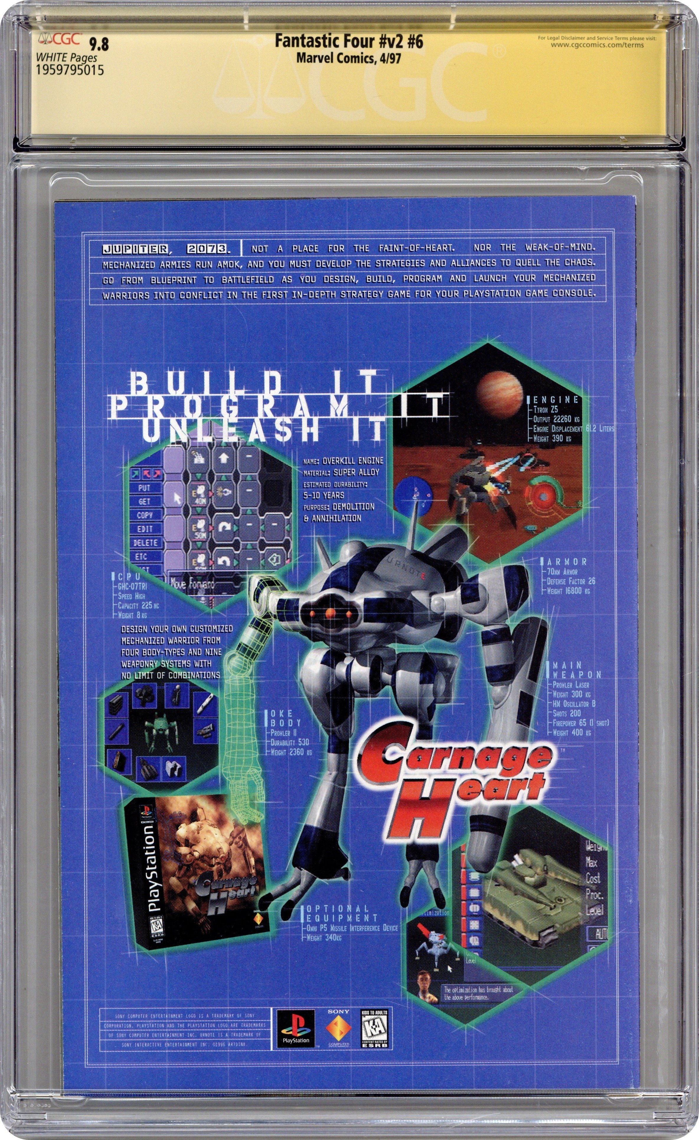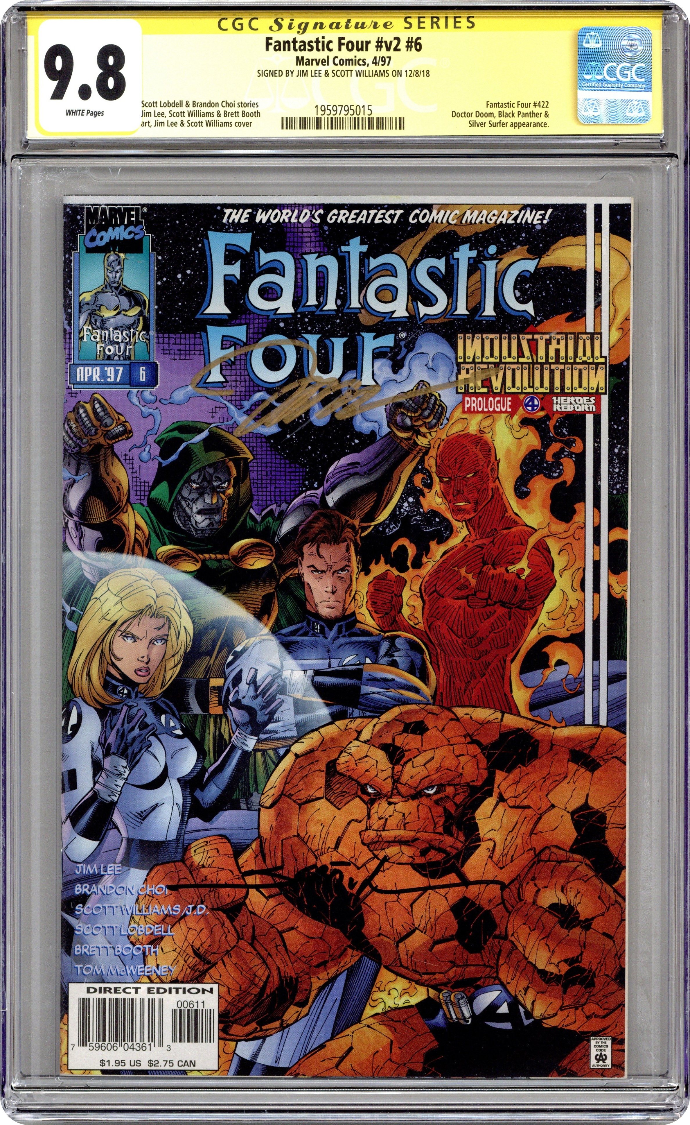 Heroes Reborn. Industrial Revolution Prologue. "Retribution!" Guest-starring the Black Panther. Hulk cameo. Story by Jim Lee and Brandon Choi. Art by Jim Lee and Scott Williams. As the Super Skrull turns on Doctor Doom, the Fantastic Four are enlightened about the being known as the Silver Surfer and the impending doom known as Galactus. Story continues in Avengers (1996-97 2nd Series) #6. Cover price $1.95. Grade: CGC 9.8 explanation of grade Condition: Used (collectible)
