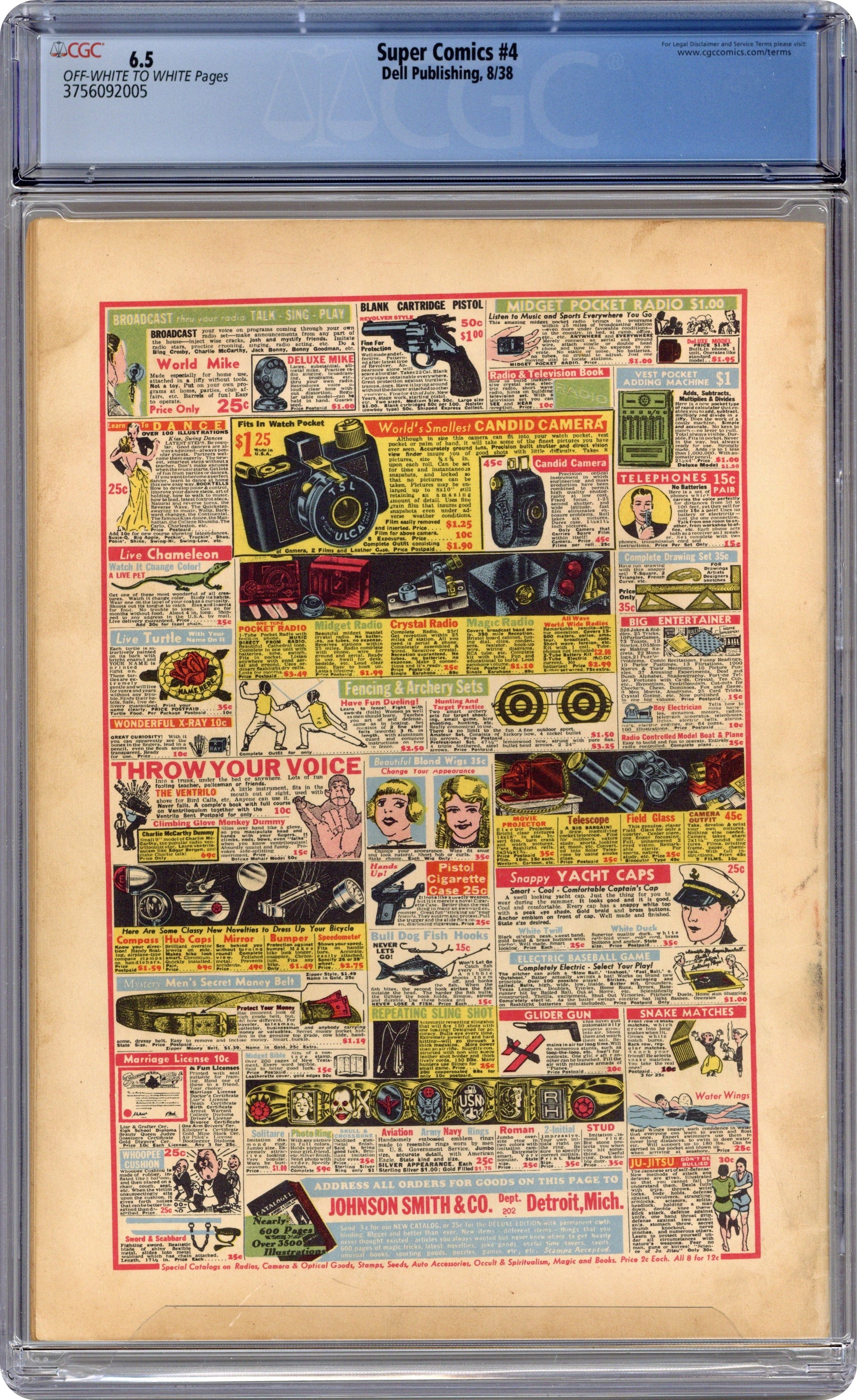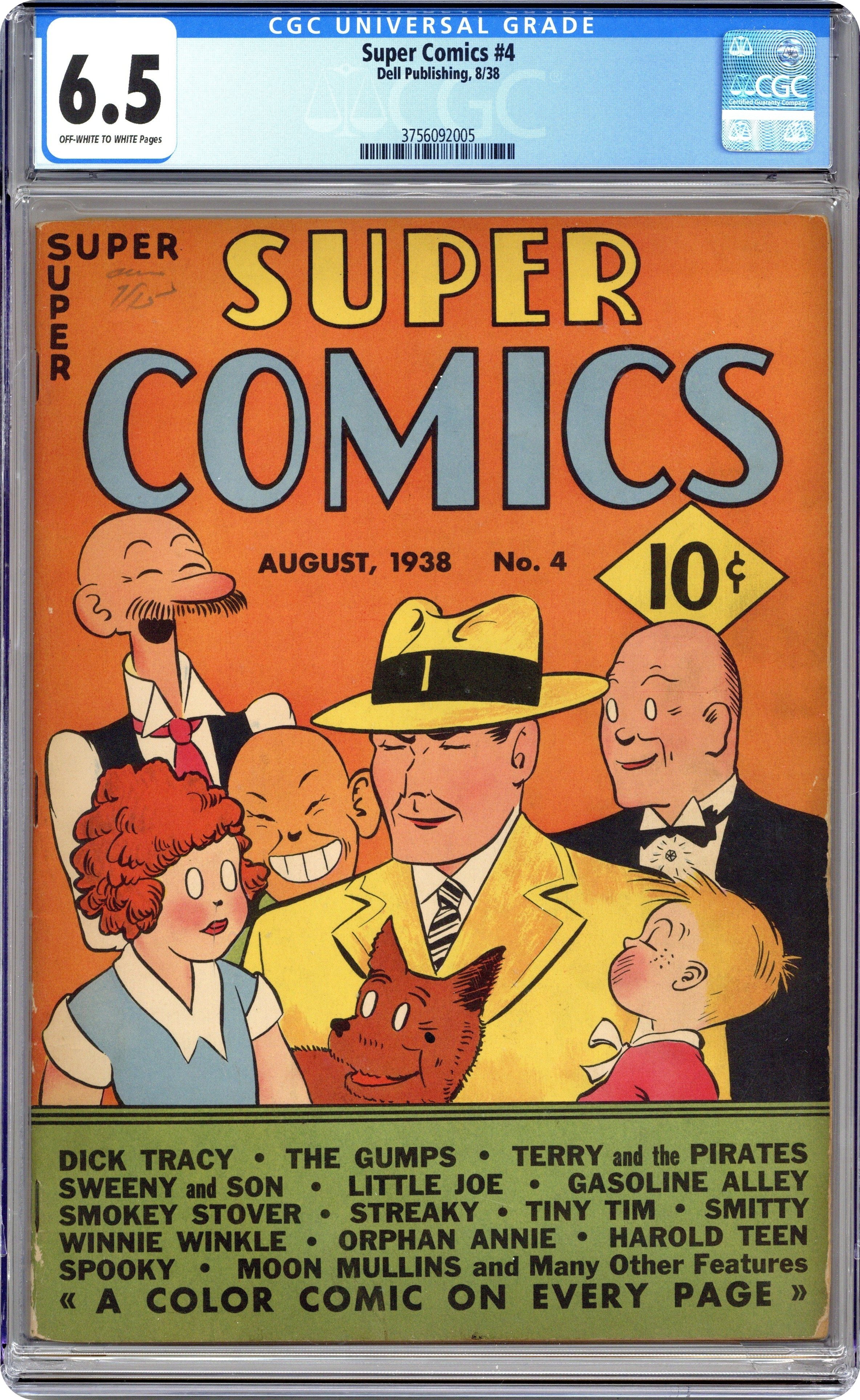 Stories and art by Milton Caniff, Chester Gould, Frank King, Harold Gray, Bill Holman, Zack Mosley, Bill Ward, Stanley Link, Frank Willard, Gus Edson, Jock McCail, Walter Berndt, Ed Leffingwell, Martin Branner, Loy Byrnes, Reg Perrott, Al Posen and Carl Ed. An early comic book from Dell, featuring reprinted newspaper comic strips alongside new material. Two women smuggle guns into the women's prison. The Dragon Lady lures Pyzon's men away so she can rescue Pat Ryan for reasons of her own. Reprints of Sunday Gasoline Alley strips, as Skeezix turns a lost ball in the neighbor's yard into an opportunity. Plus an Atlantis adventure strip with early art by Bill Ward. Also featuring popular strips Little Orphan Annie, Dick Tracy, Smokey Stover and The Gumps. Moon Mullins; Dick Tracy; Tiny Tim; Smitty; Spooky; Gasoline Alley; The Lost Colony of Atlantis; Winnie Winkle; The Gumps; Harold Teen; Little Orphan Annie; The City of Jewels; Terry and the Pirates; Streaky; Sweeney & Son; Smokey Stover; Little Joe; Skit, Skat and the Captain; Smilin' Jack. 64 pages, Full Color. Cover price $0.10. Grade: CGC 6.5 explanation of grade Condition: Used (collectible)
