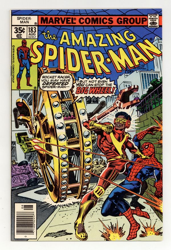 Ends Dec 8 7:19 PM CST Bid History 4 bids Current Bid $7 Your Secret Max Bid If you'd like to bid, please log in or register. "...And Where the Big Wheel Stops, Nobody Knows!" Part 2 of 2. Script by Marv Wolfman. Pencils by Ross Andru. Inks by Bob McLeod. Cover by Ross Andru and Ernie Chan. The Rocket Racer's extortion plan falls apart when the man he's blackmailing turns to the Terrible Tinkerer for help! And thanks to the old man's tinkering...the Big Wheel (aka Jackson Wheele) is born! The next day when the Big Wheel locates the Rocket Racer and the web-slinger (already fighting one another), the three-way battle begins! After the not-so-titanic tussle is over, Mary Jane finds Peter and gives him her answer. Perhaps someday she will change her mind. Cameo appearances by the Tinkerer, Toy, and Flash Thompson. (Notes: Mary Jane further explains why she turned down Peter's marriage proposal in Spectacular Spider-Man 21. Peter's second proposal takes place in Amazing Spider-Man 290. The Rocket Racer returns in Spectacular Spider-Man 104.) 36 pages. Cover price $0.35. Grade: Fine explanation of grade Condition: Used (collectible)