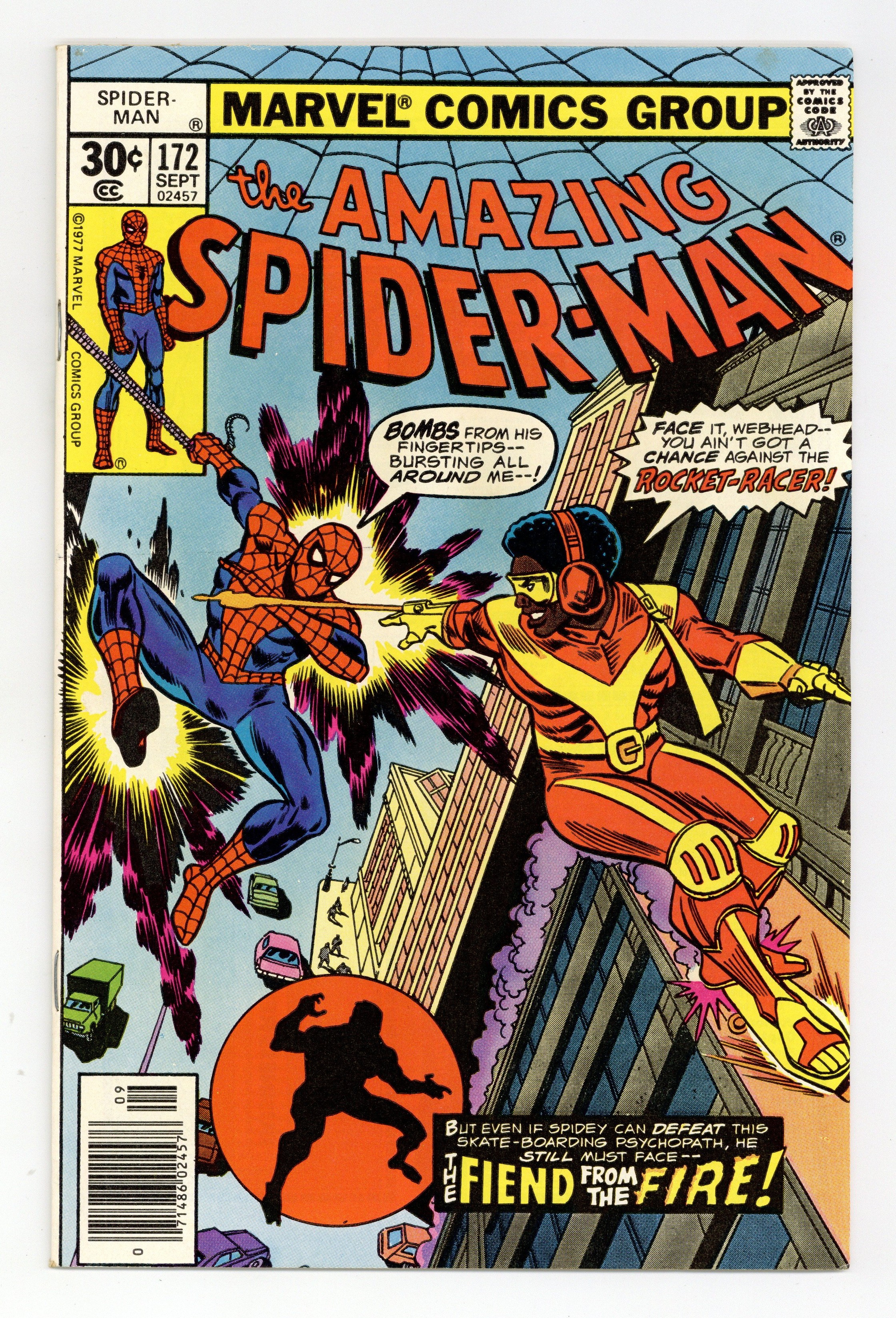 Ended Nov 17 7:19 PM CST Bid History 6 bids Winning Bid $13 "The Fiend from the Fire!" Part 1 of 2. First appearance of the Rocket Racer. Script by Len Wein. Art by Ross Andru (breakdowns) and Frank Giacoia (finishes). Cover by Ross Andru and Frank Giacoia. The action begins with a bang as the web-slinger chases a new skateboarding super-villain! The Rocket Racer! This red and yellow robber is moving and grooving through the streets on his souped-up skateboard! But the Spectacular Spider-Man is waiting right around the corner to teach him a lesson in driver etiquette! Meanwhile the police arrest Liz Allan for stealing drugs and chemicals from a local hospital! Why would Liz do that? Maybe she did it for a man! Or perhaps more specifically the Molten Man! Cameo appearances by Harry Osborn, J. Jonah Jameson, and Dr. Marla Madison. (Notes: The Rocket Racer appears next in Amazing Spider-Man 182. The Molten Man previously battled the web-slinger in Amazing Spider-Man 133. A limited distribution 35-cent cover price variant exists for this issue. 36 pages Cover price $0.30. Grade: Very Good explanation of grade Condition: Used (collectible)