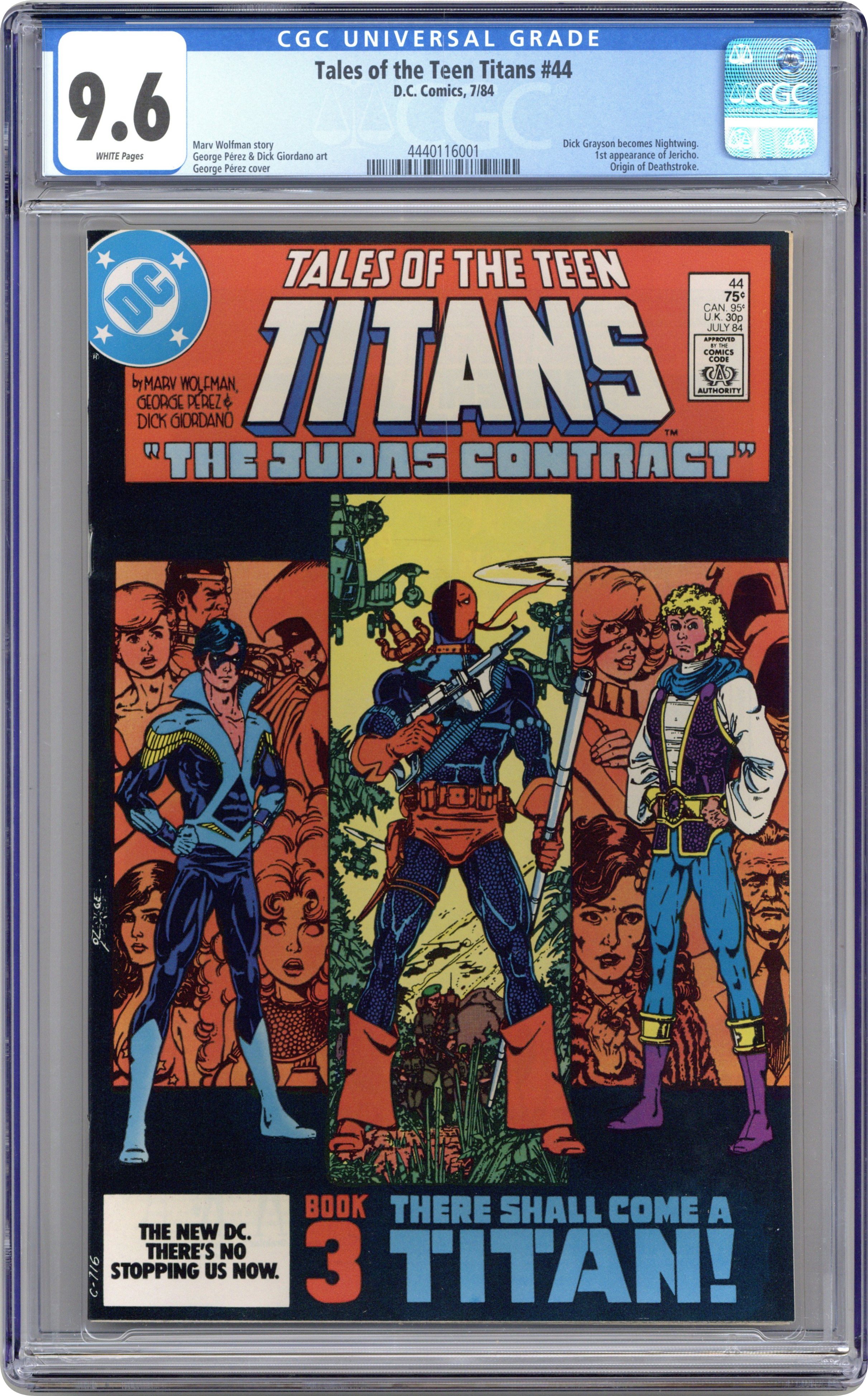 Ended Jun 30 2025 Winning Bid $89 Direct Edition. The Judas Contract: Part 3 of 4: There Shall Come a Titan! - Written by Marv Wolfman & George Perez. Art by George Perez, Dick Giordano and Mike DeCarlo. Cover by George Perez. Adeline Wilson tells Dick Grayson of the origin of Deathstroke, and Dick assumes the name Nightwing for the first time! Starring Nightwing (intro), Jericho (intro), Deathstroke the Terminator, Terra, Adeline Wilson, H.I.V.E., Wintergreen, Grant Wilson (flashback/cameo) and Jackal. Concludes in New Teen Titans (1980) Annual #3. 36 pages, full color. Cover price $0.75. Grade: CGC 9.6 explanation of grade Condition: Used (collectible)