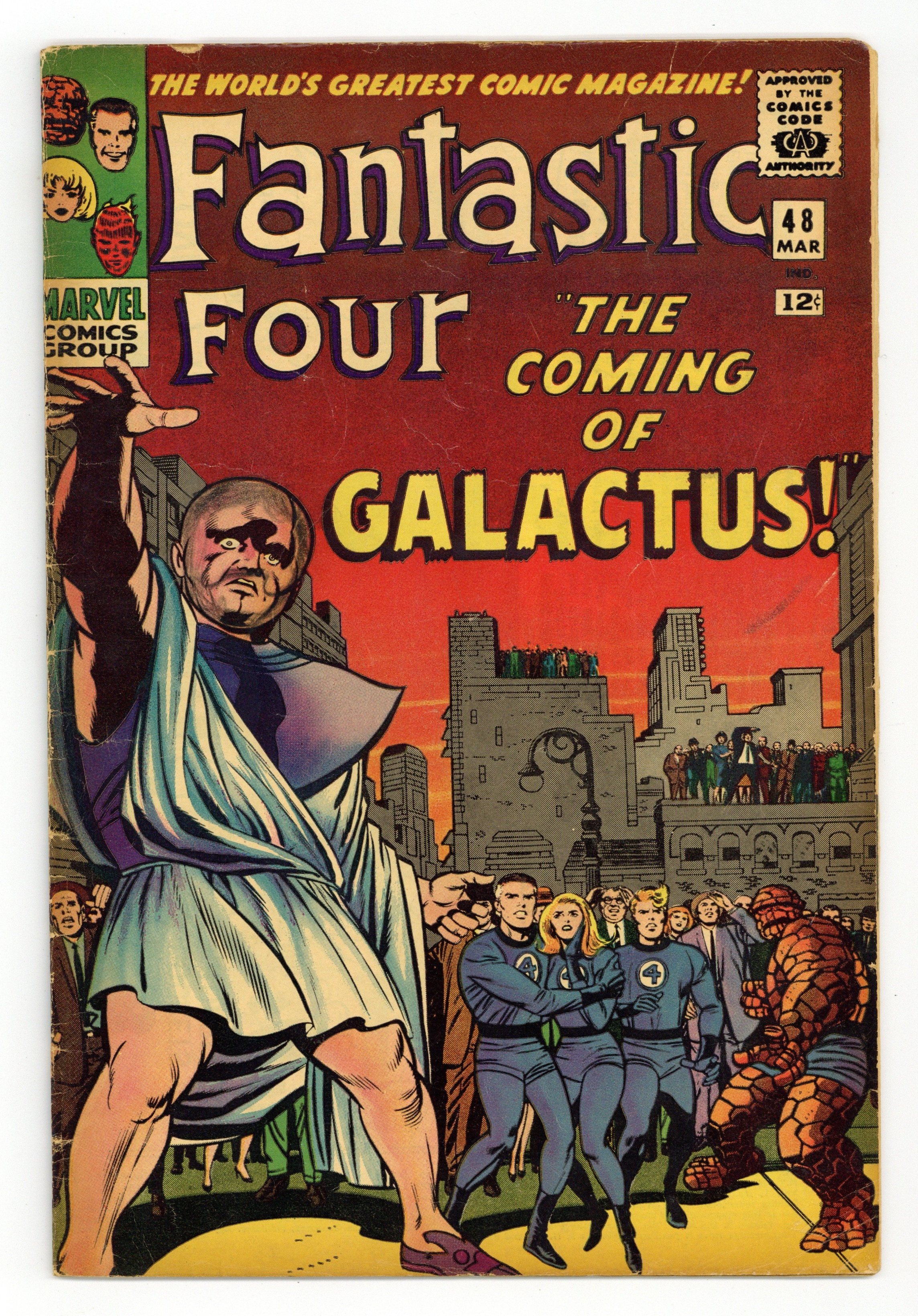 Cover pencils by Jack Kirby, inks by Joe Sinnott. First appearance of Galactus and the Silver Surfer in one of the most famous stories of the Silver Age, The Coming of Galactus!, script by Stan Lee, pencils by Jack Kirby, inks by Joe Sinnott; Black Bolt and the Fantastic Four put an end to Maximus's plan to destroy all the humans; Once the Fantastic Four return to New York the Watcher tells them of the coming danger of Galactus. Letter to the editor from comics writer Don McGregor. 36 pages, full color. Cover price $0.12. Grade: VG- 3.5 explanation of grade Condition: Used (collectible)