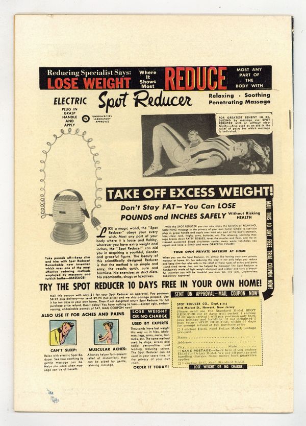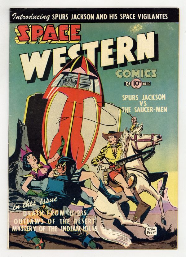 Ended Jul 14 2025 Winning Bid $451 Cover art by John Belfi. "Migration to the Moon" one-page non-fiction story. "The Saucer Men," script by Walter Gibson, art by John Belfi; When an invasion of Flying Saucers land at the Bar-Z ranch, the owner Spurs Jackson, of the Arizona ranch and his two ranch hands, Strong Bow and Hank Roper, quickly learn the alien invaders are Martians, lead by one named Korok; Spurs and his ranch hands are taken in the saucers back to Mars. "The Outlaws of the Desert," art by John Belfi; Men are hijacking trucks bringing supplies to the New Pueblo dam; It's up to Hank Roper and Sheriff Townley to stop them. "Incident at Powder River," art by Lou Morales; Two men ride into town; One of them, named Frank, is shot by a man called Black Nick; The other man returns fire and kills the shooters. "The Moon Monsters" text story. "Death from U-235," script by Walter Gibson; When a man falls dead from radiation poisoning, Spurs Jackson is a prime suspect; Spurs had claimed a desire for revenge against the man for murdering father; When it is proven the man died of radiation poisoning, Spurs and Hank Roper investigate to discover a spaceship. "The Mystery of the Indian Hills"; When Jigg Larsen and his cattle rustlers raid the Arizona ranch owned by Laura Towne, the Rancho Oro, he has his men burn the ranch house with Stew Carey inside; Strong Bow, one of Spurs Jackson's Space Vigilantes, finds the burning ranch and rescues Stew Carey. "How a Visitor from Space Won the Great West for America" half-page story about Tecumsah. Indicia states "SPACE WESTERN COMICS." 36 pgs., full color. Cover price $0.10. Grade: VG+ 4.5 explanation of grade Condition: Used (collectible)