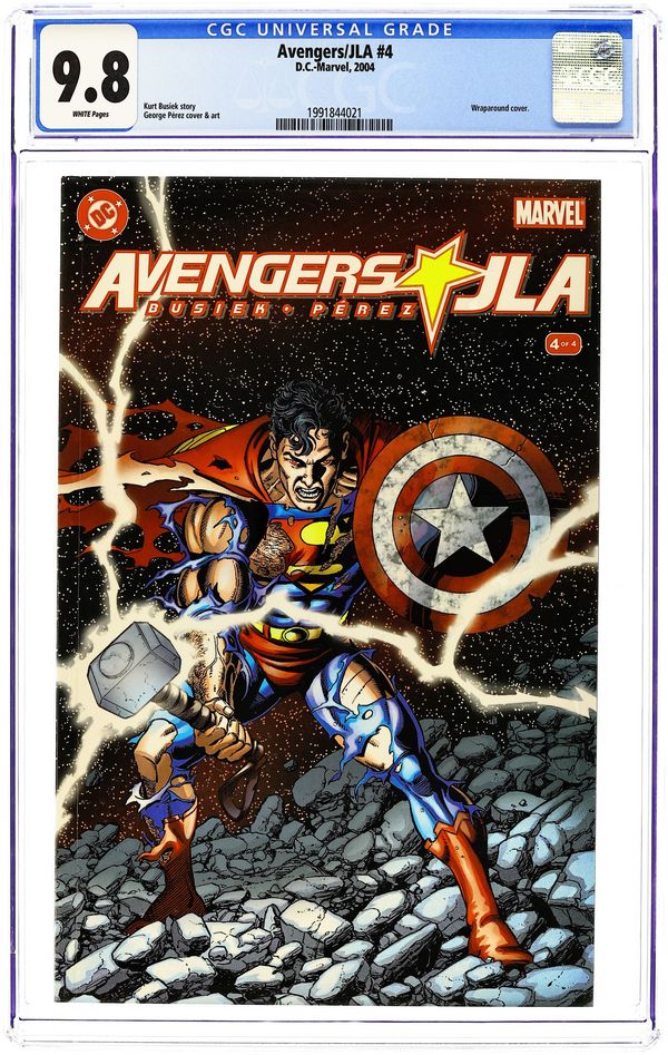 Ended Jun 16 2025 Winning Bid $77 WRITTEN BY KURT BUSIEK; ART AND COVER BY GEORGE PÉREZ Celebrate the finale of the biggest crossover in comics history! The World's Greatest team-up of Earths' Mightiest Heroes climaxes with the fate of both universes hanging in the balance! This one is crammed full of everything you read comics for. Cover price $5.95. Grade: CGC 9.8 explanation of grade Condition: Used (collectible)