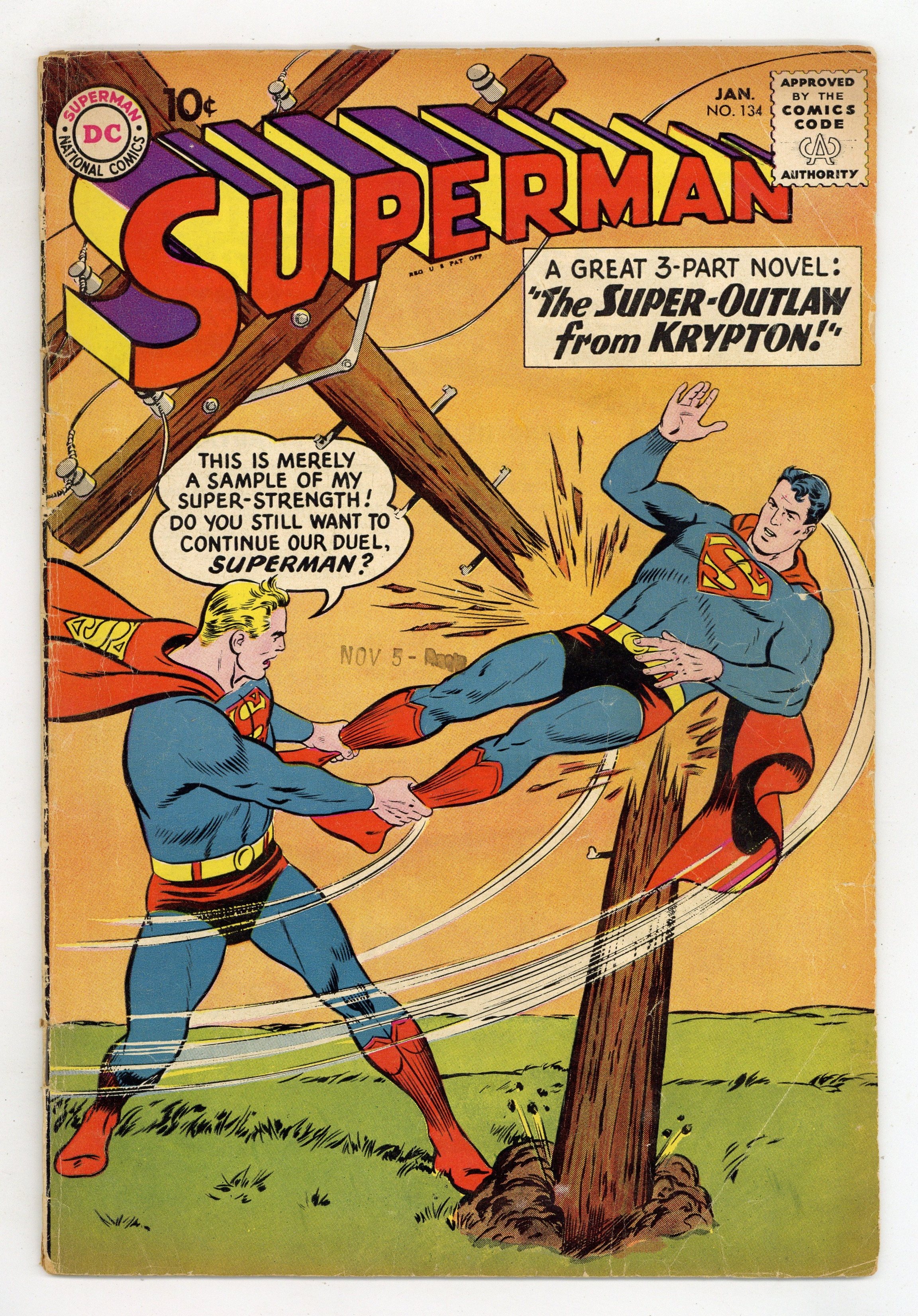 Ended Jul 28 2025 Bid History 13 bids Winning Bid $30 Cover pencils by Curt Swan, inks by Stan Kaye. The Super-Outlaw From Krypton: Part 1: The Super-Menace of Metropolis, script by Otto Binder, pencils by Wayne Boring, inks by Stan Kaye; Superman has gone crazy, causing unnecessary damage whenever he performs a super-feat. The Super-Outlaw From Krypton: Part 2: The Revenge Against Jor-El; Kull-Ex has tricked Superman into switching places. he Super-Outlaw From Krypton: Part 3: The Duel of the Supermen; Supergirl rescues Superman from Kandor (Supergirl's first appearance in this series). 36 Pages, Full Color. Cover price $0.10. Grade: GD+ 2.5 explanation of grade Condition: Used (collectible)