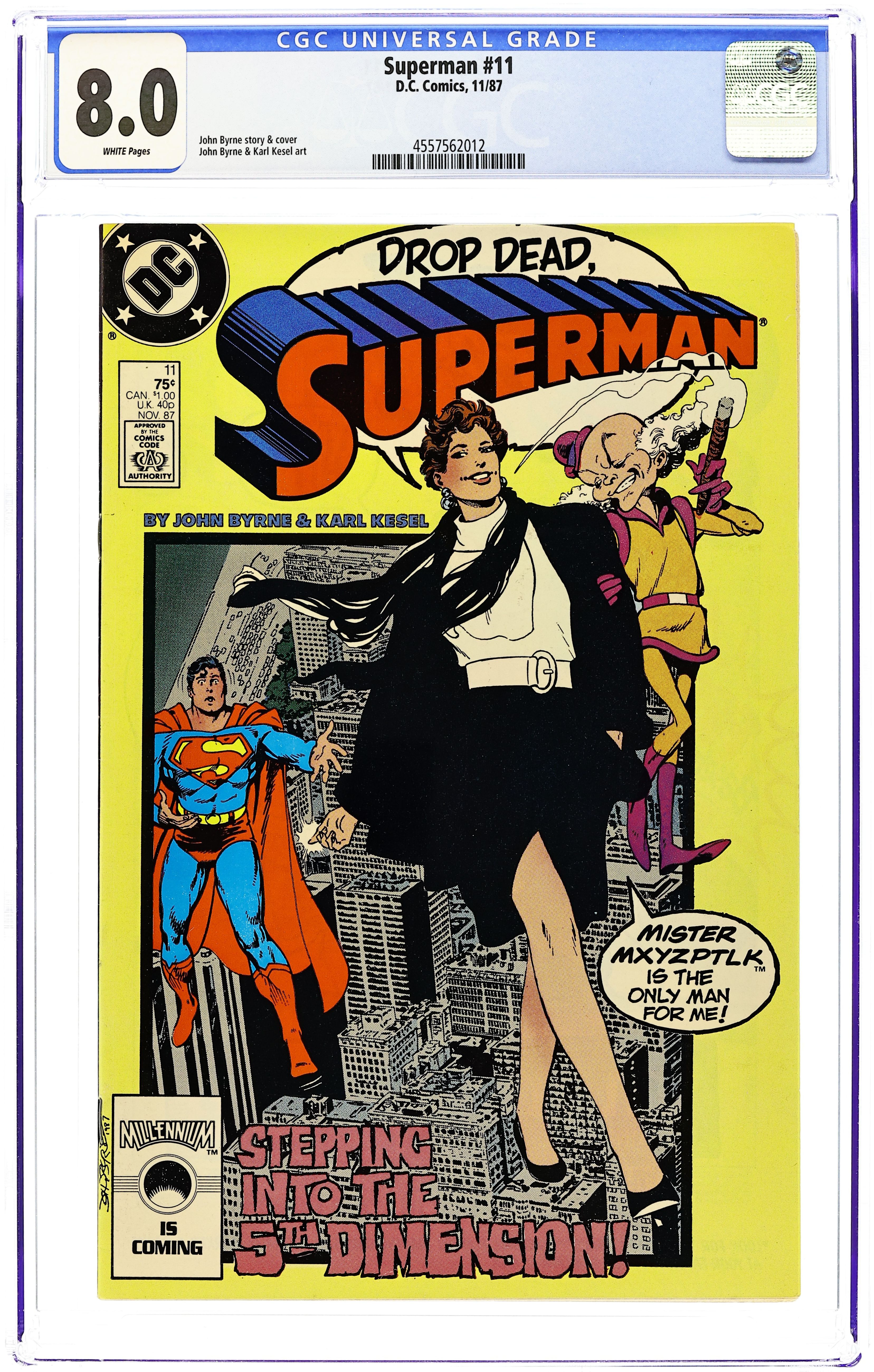 "The Name Game!" Story by John Byrne. Art by John Byrne and Karl Kesel. That mischievous imp from the Fifth Dimension makes his post-Crisis debut. Superman has abilities far beyond those of mortal men, but how can even the Last Son of Krypton compete with Mister Mxyzptlk, a being whose very wish becomes reality? Cover price $0.75. Grade: CGC 8.0 explanation of grade Condition: Used (collectible)