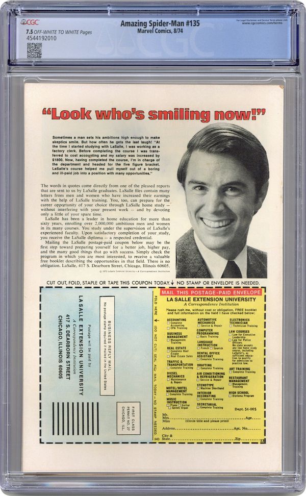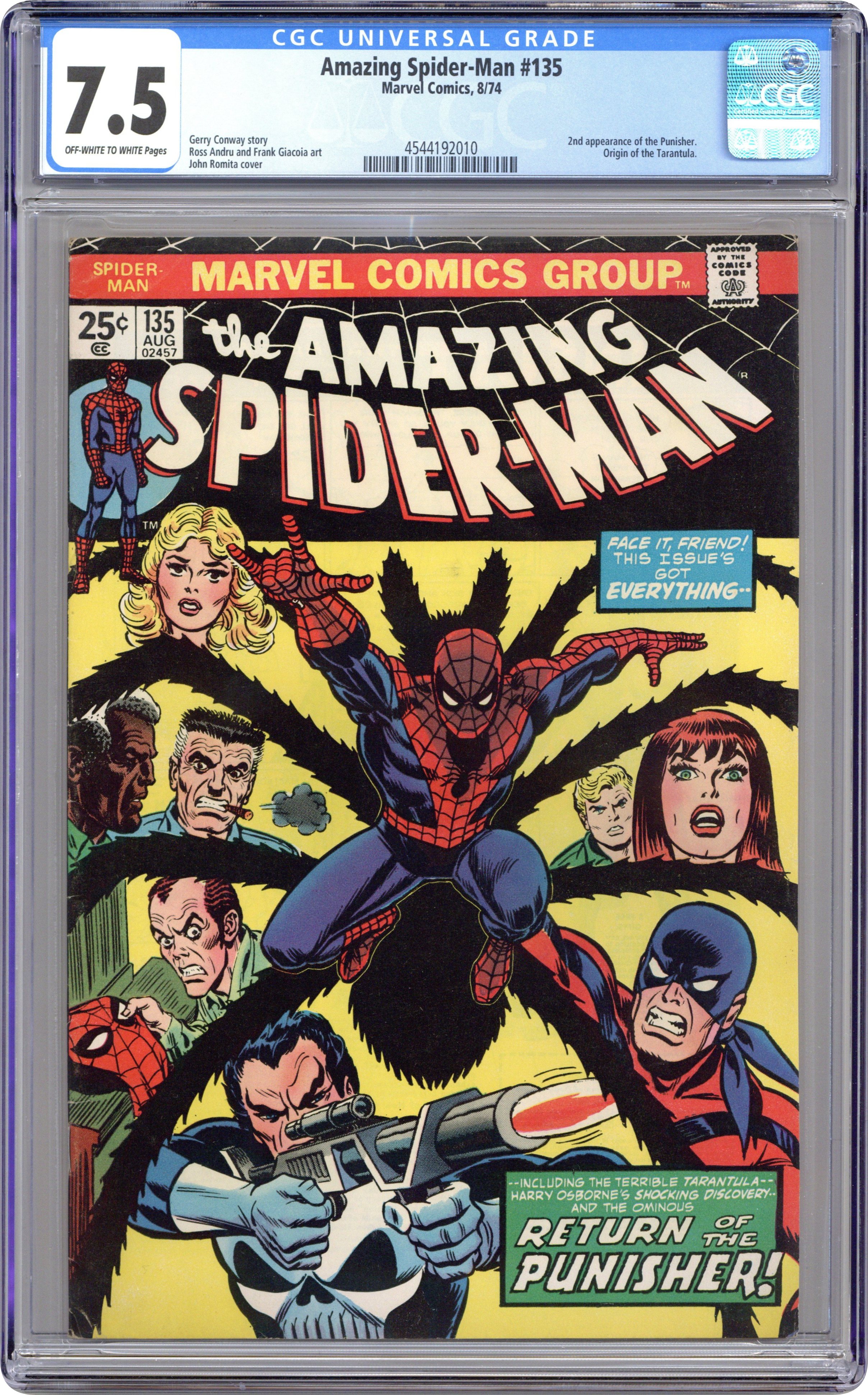 Cover by John Romita Sr. Second full appearance of the Punisher in "Shoot-Out in Central Park," script by Gerry Conway, pencils by Ross Andru, inks by Frank Giacoia; Spider-Man finds himself in a shoot-out with Tarantula and Punisher after saving a cruise ship from hijacking; Peters friends grow suspicious about his double identity; Harry Osborn discovers Peters spider suit! Letter to the editor from Steve Saffel. The letters page also has Marvel Value Stamp series A # 4: Thing (of the Fantastic Four). Reprinted in Marvel Tales # 112 and 211. 36 pgs., full color. $0.25. Cover price $0.25. Grade: CGC 7.5 explanation of grade Condition: Used (collectible)