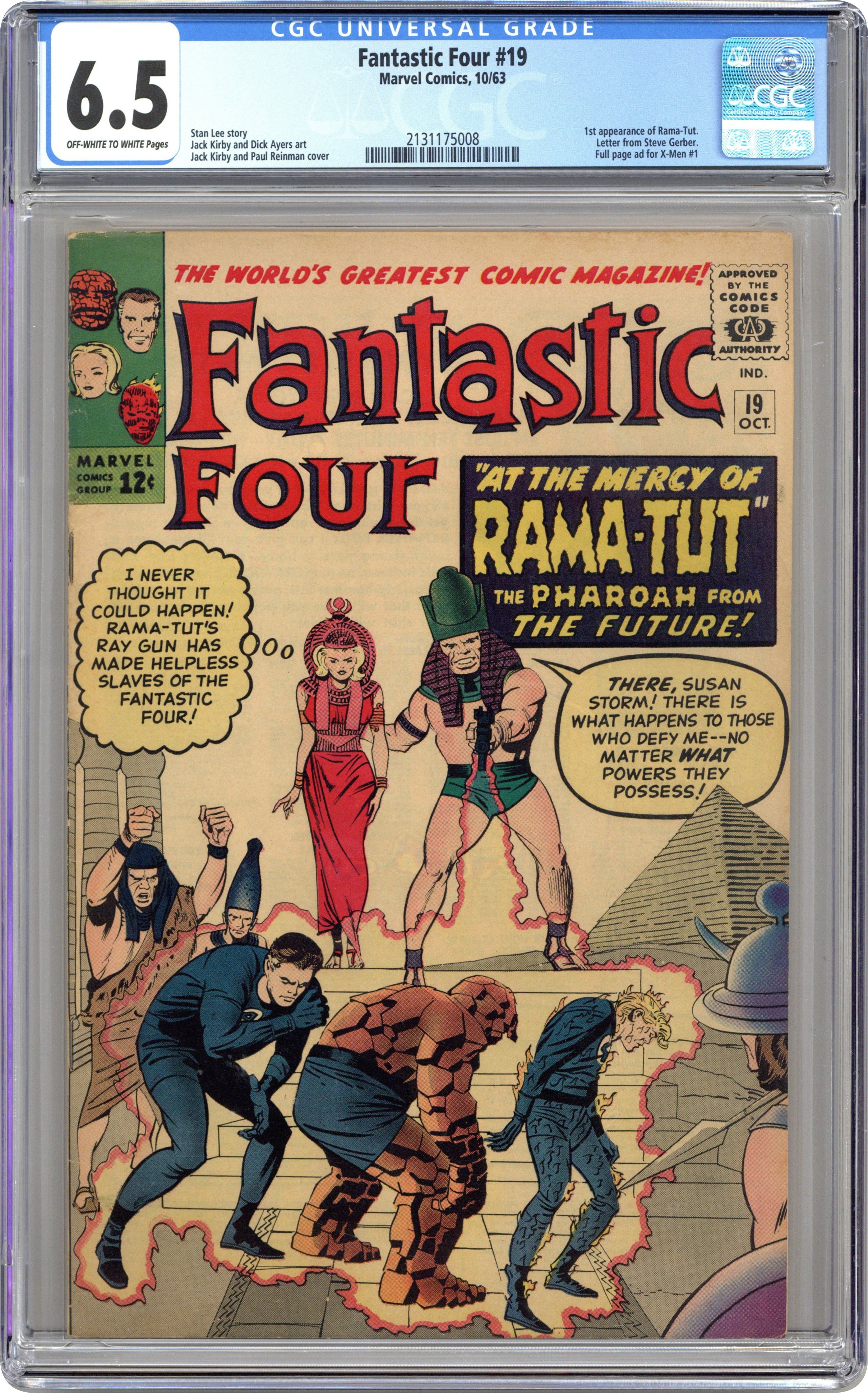 Ended Jul 15 2025 Winning Bid $455 Cover pencils by Jack Kirby, inks by Paul Reinman. First appearance of Pharaoh Rama-Tut in "Prisoners of the Pharoah!, script by Stan Lee, pencils by Jack Kirby, inks by Dick Ayers; The Fantastic Four return to Ancient Egypt to try to find a cure for Alicia's blindness and are met by Rama-Tut, a time traveler from the year 3000. Cameos by the Mole Man, the Puppet Master, the Super-Skrull, and Doctor Doom. Letter to the editor from comics writer Steve Gerber. The events of this very issue can be seen from different points of view in the pages of Doctor Strange (1974 2nd Series) #53 and Avengers West Coast (1985) #22. 36 pgs. $0.12. Cover price $0.12. Grade: CGC 6.5 explanation of grade Condition: Used (collectible)