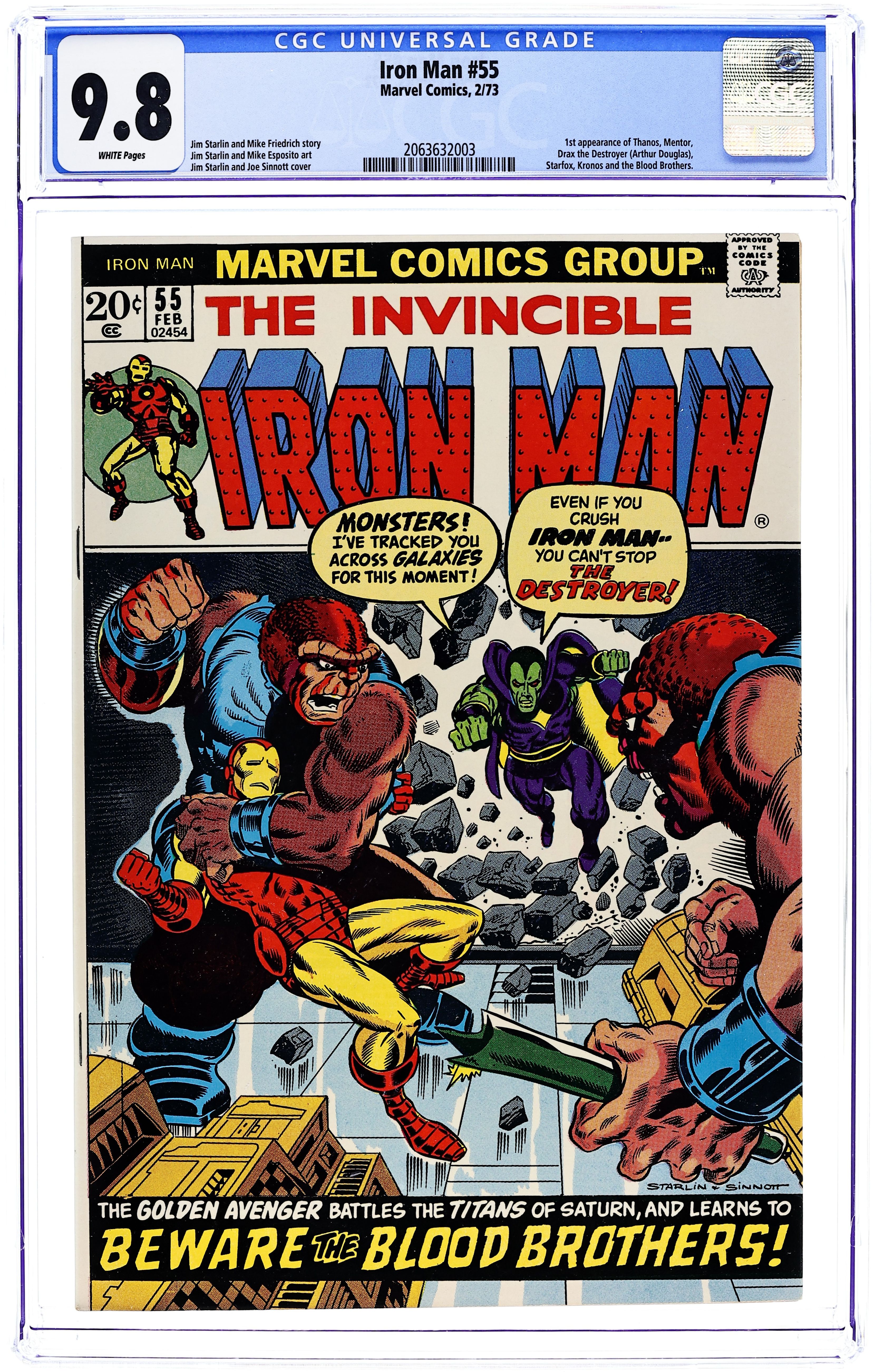 Ended Jul 16 2025 Bid History 25 bids Winning Bid $5,544 "Beware the Blood Brothers!" First appearance of Thanos. Story by Jim Starlin. Art by Jim Starlin and Mike Esposito. Cover by Jim Starlin and Joe Sinnott. One of the landmark Marvel issues of the Bronze Age. Drax the Destroyer is a prisoner of Thanos at the evil Titan's Earth-fortress. In an effort to escape, Drax telepathically reaches out to Tony Stark for assistance; but before Iron Man can come to the rescue, Shell-Head is ambushed by the Blood Brothers! Can Drax and the golden avenger defeat the Blood Brothers and Thanos? Also first appearances of Drax the Destroyer, Starfox (in a flashback), and Mentor. (Note: Iron Man 55 was reprinted as a Marvel Milestone Edition in 1992.) 36 pages Cover price $0.20. Grade: CGC 9.8 explanation of grade Condition: Used (collectible)