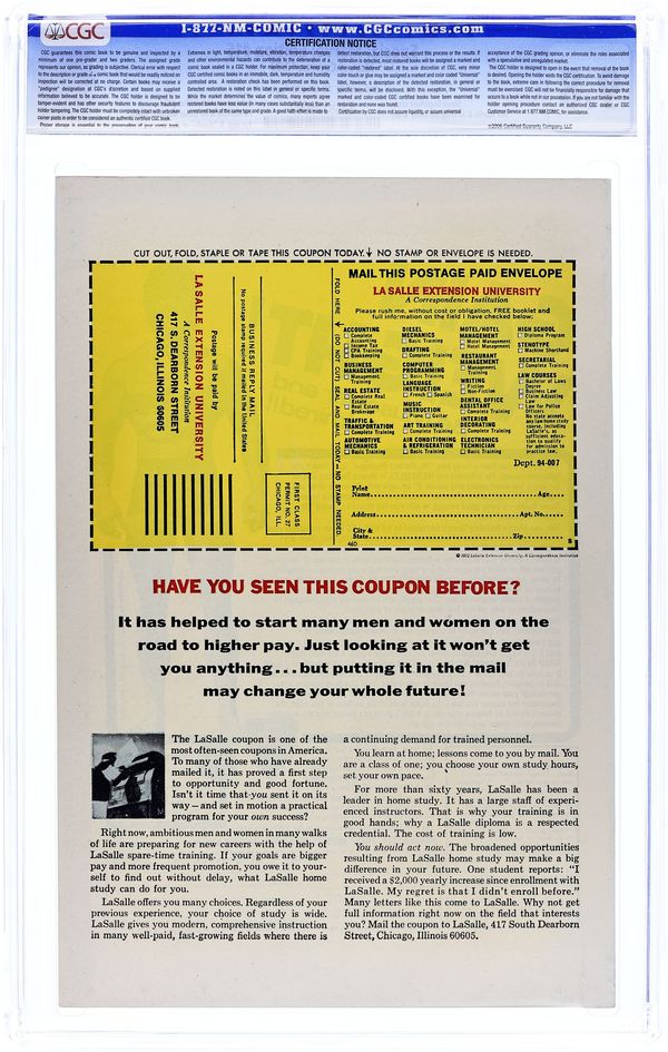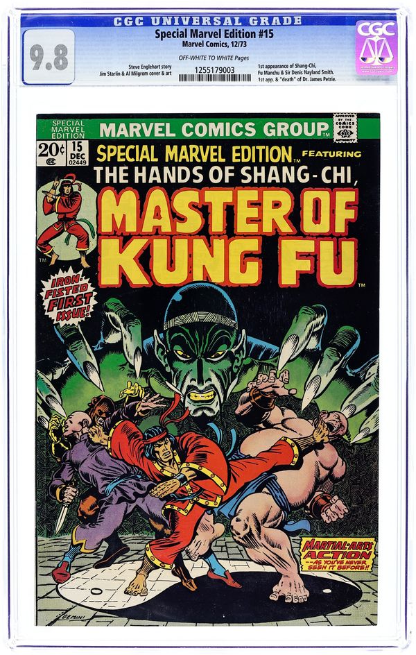 Ended Jul 16 2025 Bid History 22 bids Winning Bid $2,300 Written by Steve Englehart and Jim Starlin. Art and cover by Jim Starlin and Al Milgrom. Shang Chi, making his first appearance, is a master of martial arts and the son of Fu Manchu, a Chinese mandarin and scientist. Fu Manchu sends Shang Chi to England in order to assassinate the evil Dr. Petrie for the common good. Shang Chi reluctantly agrees, but after the deed is done he is confronted by Sir Denis Nayland Smith, a former British intelligence officer who tells him the truth about Fu Manchu; that he is a nearly immortal evil mastermind. Shang Chi travels back to his father's secret lair in New York and renounces him. Text articles by Roy Thomas and Englehart about the creation of Shang-Chi. Ad for Astonishing Tales #21. A brief obituary for Syd Shores. Ad for the Marvel fan club FOOM (Friends of Ol' Marvel). 36 pages, full color. $0.20. Cover price $0.20. Grade: CGC 9.8 explanation of grade Condition: Used (collectible)