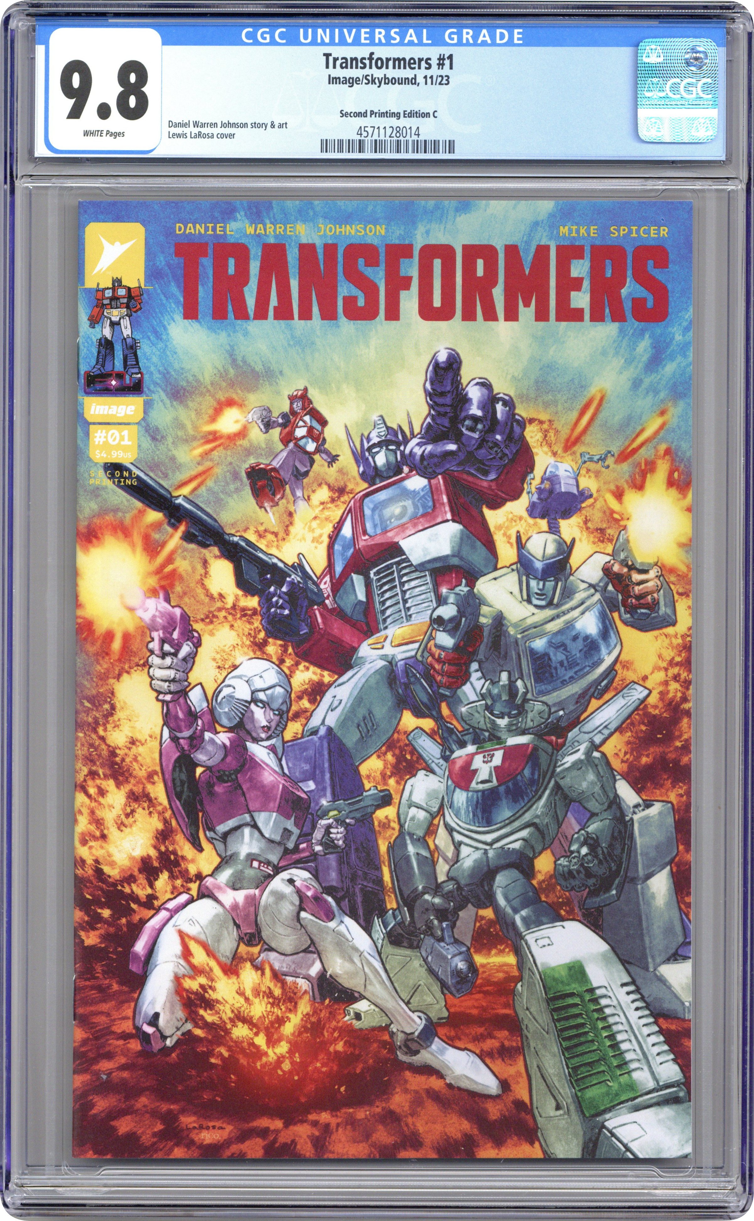 2nd Printing. Written by Daniel Warren Johnson. Art by Mike Spicer, Daniel Warren Johnson. Cover by Lewis LaRosa. SERIES PREMIERE THE ALL NEW TRANSFORMERS ERA STARTS HERE! Superstar creator DANIEL WARREN JOHNSON (DO A POWERBOMB, Wonder Woman: Dead Earth), alongside ENERGON UNIVERSE showrunner ROBERT KIRKMAN (VOID RIVALS, INVINCIBLE), reimagines Hasbro's robots in disguise for a brand-new generation. Optimus Prime was supposed to have led the Autobots to victory. Instead, the fate of Cybertron is unknown, and his allies have crash-landed far from home, alongside their enemies-the Decepticons. As these titanic forces renew their war on Earth, one thing is immediately clear: the planet will never be the same. New alliances are struck. Battle lines are redrawn. And humanity's only hope of survival is Optimus Prime. Discover THE TRANSFORMERS like you've never seen them before! 36 pages, full color. Rated T Cover price $4.99. Grade: CGC 9.8 explanation of grade Condition: Used (collectible)