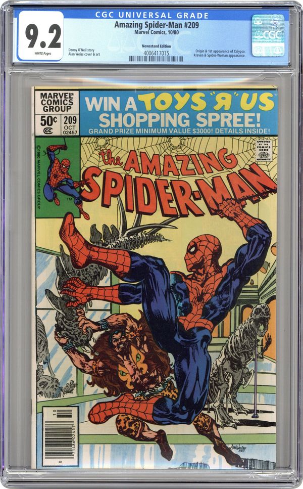Newsstand Edition. "To Salvage My Honor!" First appearance of Calypso. Script by Denny O'Neil. Pencils by Alan Weiss. Inks by Klaus Janson, Bob McLeod, Joe Rubinstein, Bob Wiacek, and Al Milgrom. Cover by Alan Weiss. The specter of Spider-Man still haunts Kraven the Hunter! But Kraven's new accomplice, Calypso, has a plan to change that! While delivering a herd of exotic animals to the city, Calypso releases them to run wild in the streets! And then blames the web-slinger for setting them free! After Kraven subdues the loose animals, he vows to make the wall-crawler pay for this (alleged) indignity! And the next evening at the Museum of Natural History, the Amazing Spider-Man and Kraven the Hunter clash again! The survival of the fittest! Cameo appearance by Spider-Woman. (Note: Kraven and Calypso appear next in Spectacular Spider-Man 65.) 36 pages Cover price $0.50. Grade: CGC 9.2 explanation of grade Condition: Used (collectible)