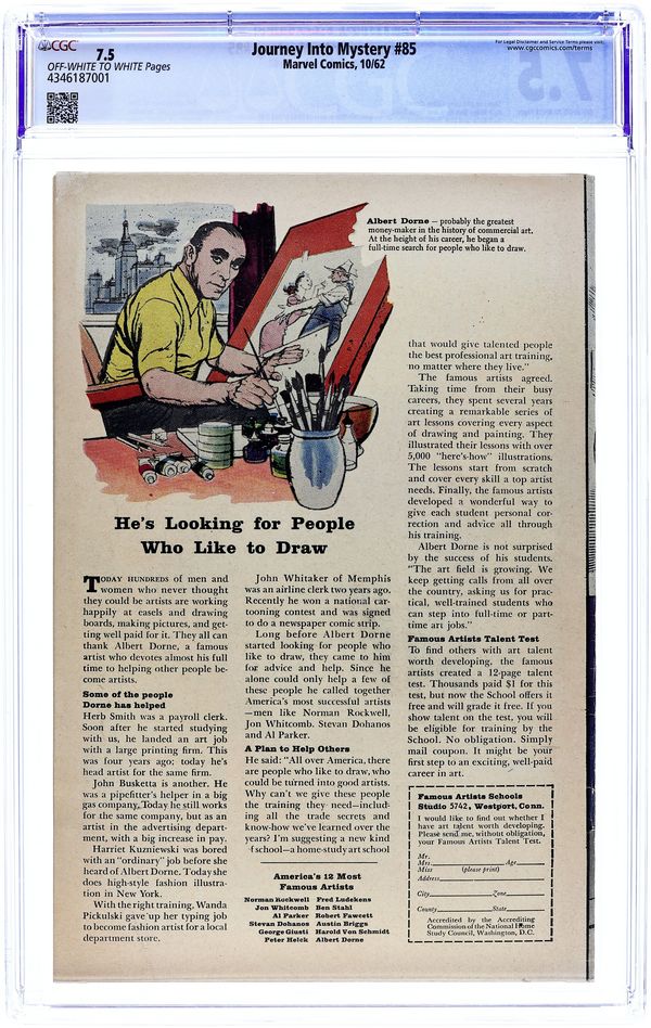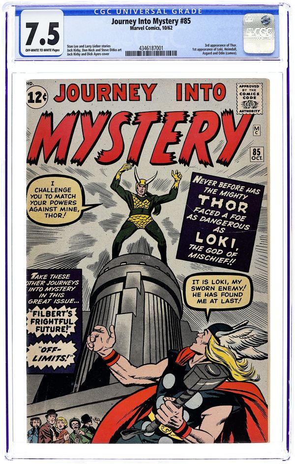 Ended Jul 16 2025 Bid History 26 bids Winning Bid $5,900 Cover pencils by Jack Kirby, inks by Dick Ayers. First appearance Loki and Heimdall, plus cameos of Odin, Balder, and Tyr, in "Trapped by Loki, the God of Mischief!", script by Stan Lee (plot) and Larry Lieber (script), pencils by Jack Kirby, inks by Dick Ayers; Loki escapes from his prison in Asgard and comes to Earth to get revenge on Thor; The trickster hypnotizes him to help make mischief. "The Clock" two-page text story. "Filbert's Frightful Future!", script by Stan Lee, art by Don Heck; A greedy scientist builds a time machine to visit the future and make money, but he finds himself stranded in a void, since the future does not yet exist. "Off-Limits!", script by Stan Lee, art by Steve Ditko; This story casts the character of Rip Van Winkle as a humanoid alien who visits planet Earth in violation of galactic travel guidelines which have declared the planet off limits. 36 pgs., full color. $0.12. Cover price $0.12. Grade: CGC 7.5 explanation of grade Condition: Used (collectible)