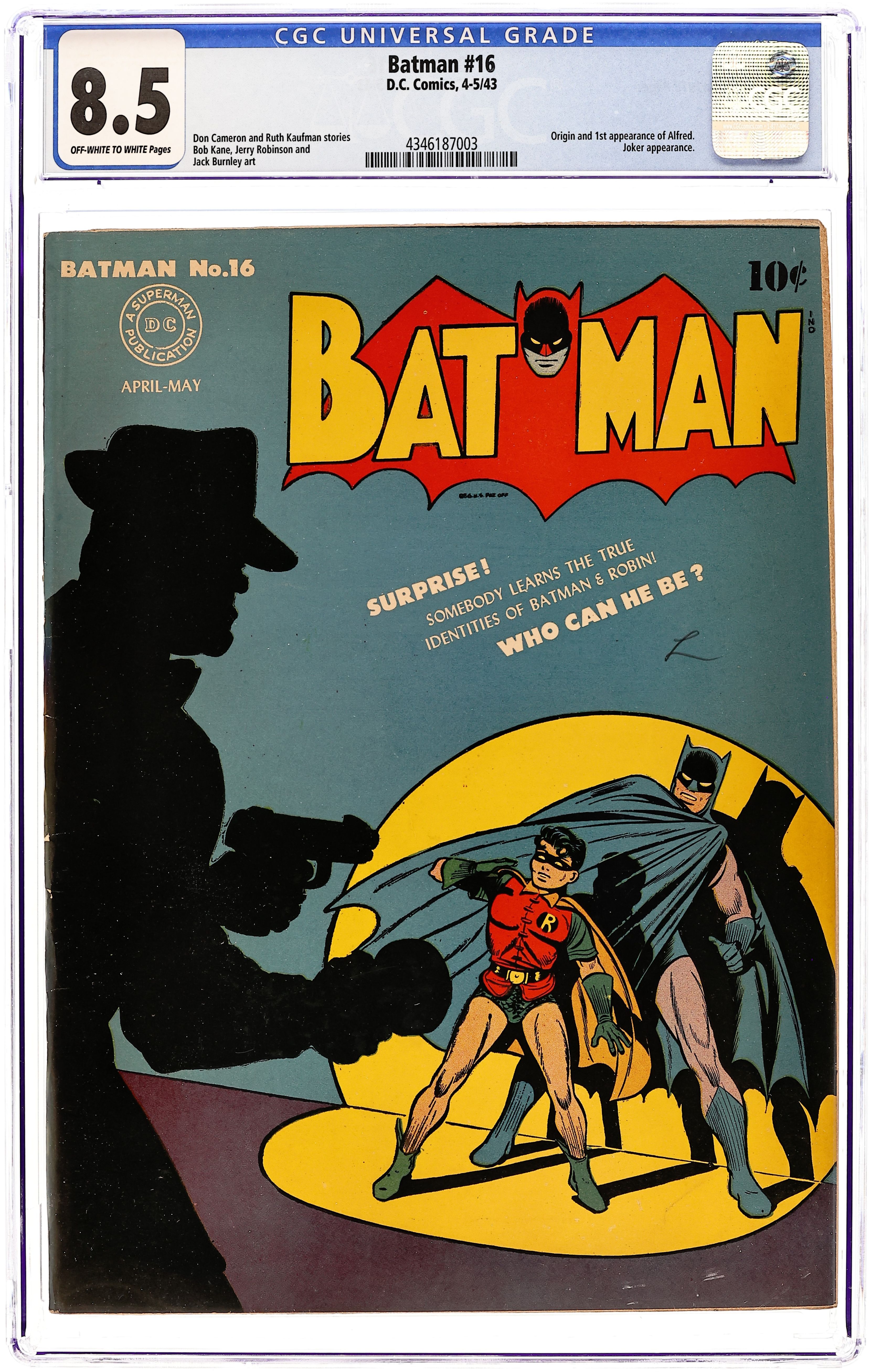 Ended Jul 14 2025 Bid History 31 bids Winning Bid $18,000 1st appearance of Alfred Pennyworth - Cover by Jerry Robinson. "The Joker Reforms!", script by Don Cameron, pencils by Bob Kane, inks by Jerry Robinson and George Roussos; After robbing a jewelry store, the Joker crash-lands his escape plane and loses his memory; He stumbles into a town where he becomes a hero... but not to the other members of his gang, who seek the jewels, and come looking for him, as do the Caped Crusaders. One-page Shorty story by Henry Boltinoff. "The Grade A Crimes!", script by Ruth "Bunny" Lyons Kaufman (as Bunny Lyons), pencils by Jack Burnley, inks by Jack Burnley and Ray Burnley (backgrounds); After a series of early-bird robberies, Batman notes the appearances of a milkman and his horse-drawn wagon at the scene of every crime, and makes the connection that it is involved in the heists. "The Adventure of the Branded Tree!", script by Don Cameron, pencils by Jack Burnley, inks by Jack Burnley and Ray Burnley (backgrounds); Batman and Robin track down the secret of a dagger-branded tree that led to the murder of two lumberjacks. "Motive" text story by Eric Carter. One-page Clancy the Cop story by Henry Boltinoff. "Here Comes Alfred!", script by Don Cameron, pencils by Bob Kane, inks by Jerry Robinson and George Roussos (backgrounds); Things get very complicated when an English butler, named Alfred, suddenly shows up on the doorstep of Wayne Manor and announces that he is there is attend to their needs in order to fulfill a promise that he made to the original butler for the Wayne family. 68 Pages, Full Color. Cover price $0.10. Grade: CGC 8.5 explanation of grade Condition: Used (collectible)