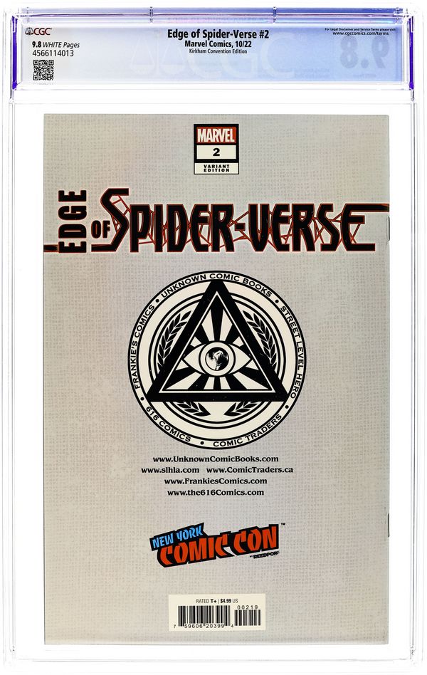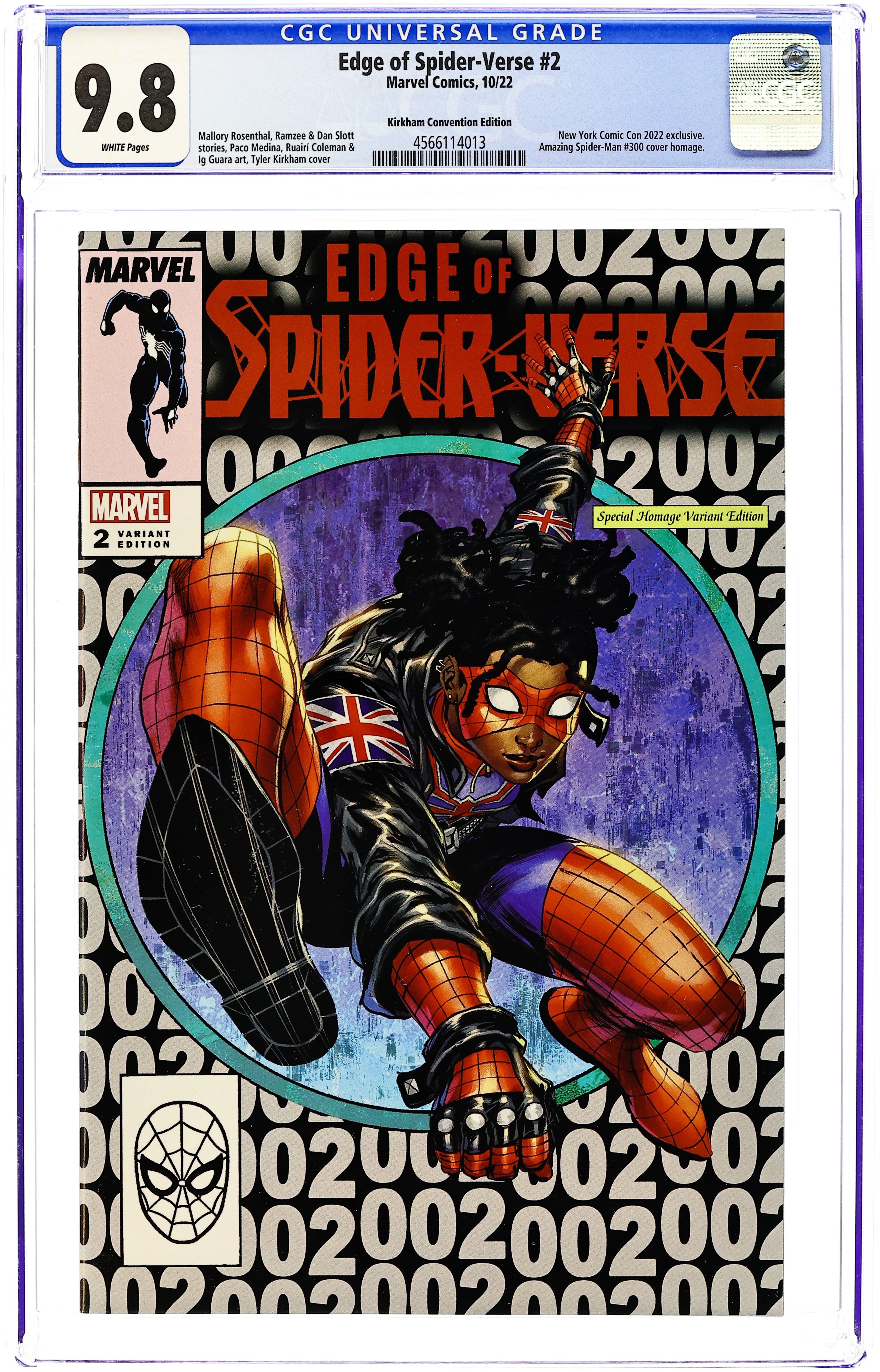 Ended Jun 28 2025 Winning Bid $20 Comics Illuminati (Unknown Comics, Street Level Hero, Comic Traders, Anti-Hero Gallery, and The 616 Comics) New York Comic Con Exclusive Variant Cover by Tyler Kirkham. Written by Dan Slott. Art by Mark Bagley. IN THIS ISSUE: SPIDER-GWEN! THE NEW SPIDER-UK! MINI-SPIDEY! And get to know your antagonist for this huge story! 36 pages, full color. RATED T+ Grade: CGC 9.8 explanation of grade Condition: Used (collectible)