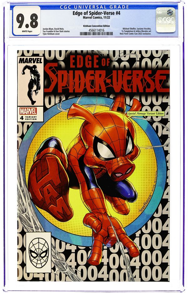 Ended Jun 27 2025 Winning Bid $34 Comics Illuminati (Unknown Comics, Street Level Hero, Comic Traders, Frankie's Comics, and The 616 Comics) New York Comic Con Exclusive Cover by Tyler Kirkham. Written by Dan Slott. Art by Nathan Stockman. SPIDER-HAM! SPIDER-MOBILE! SUN-SPIDER! SPINSTRESS! You know the first two, but you may not remember the Amazing Sun-Spider who debuted in 2020's SPIDER-VERSE miniseries as a winner of our Spidersona contest! She gets her own story here! And Spinstress is a brand new Spider-Princess who sings, talks to a spider and kicks villainous butt! And the writers of the Broadway smash hit COME FROM AWAY are bringing her in for a landing! 36 pages, full color. Rated T+ Grade: CGC 9.8 explanation of grade Condition: Used (collectible)
