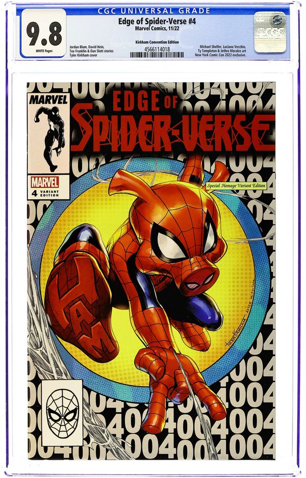 Ended Jul 8 2025 Winning Bid $26 Comics Illuminati (Unknown Comics, Street Level Hero, Comic Traders, Frankie's Comics, and The 616 Comics) New York Comic Con Exclusive Cover by Tyler Kirkham. Written by Dan Slott. Art by Nathan Stockman. SPIDER-HAM! SPIDER-MOBILE! SUN-SPIDER! SPINSTRESS! You know the first two, but you may not remember the Amazing Sun-Spider who debuted in 2020's SPIDER-VERSE miniseries as a winner of our Spidersona contest! She gets her own story here! And Spinstress is a brand new Spider-Princess who sings, talks to a spider and kicks villainous butt! And the writers of the Broadway smash hit COME FROM AWAY are bringing her in for a landing! 36 pages, full color. Rated T+ Grade: CGC 9.8 explanation of grade Condition: Used (collectible)