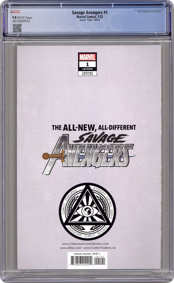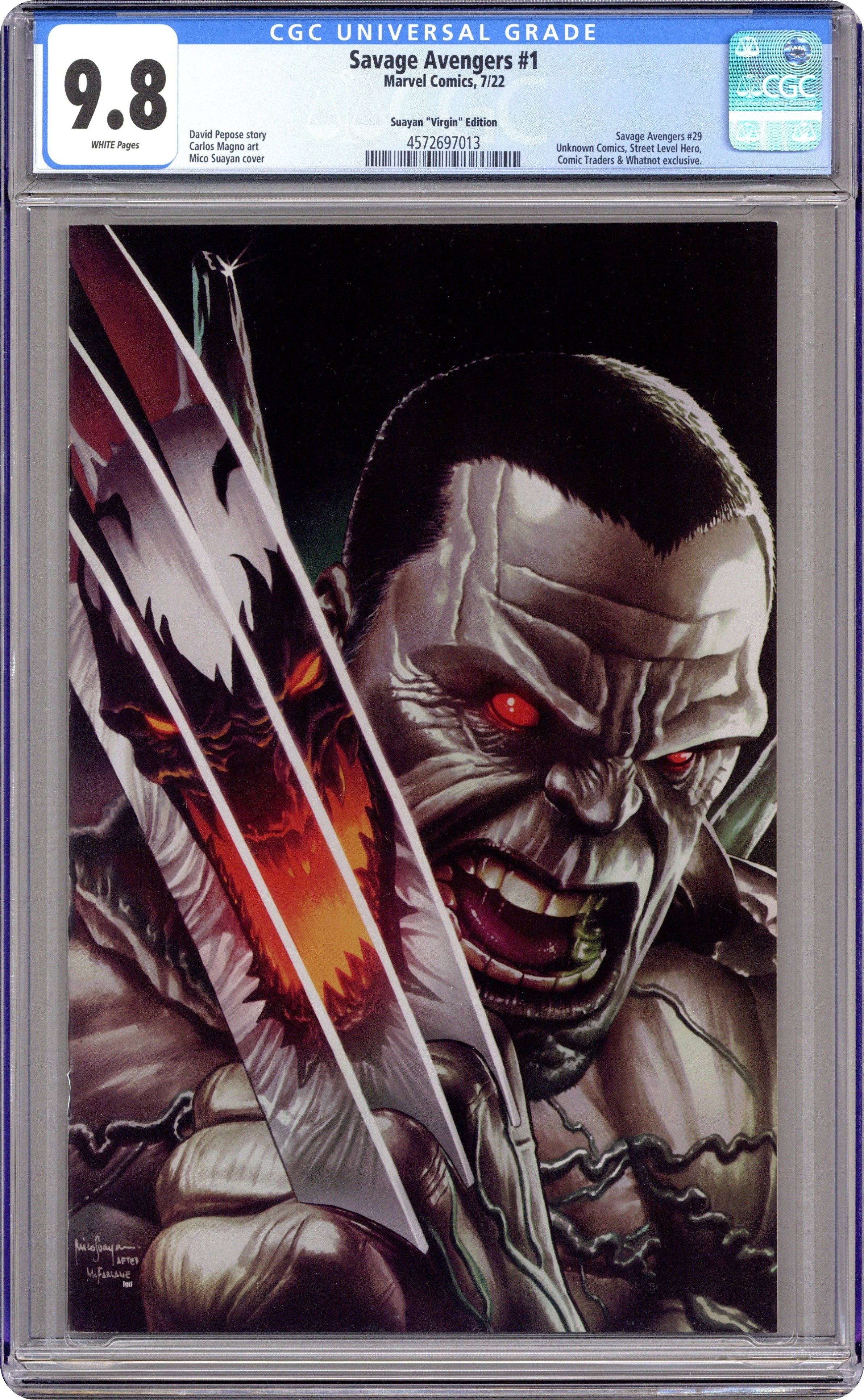 Ended Jun 23 2025 Winning Bid $46 Comics Illuminati (Unknown Comics, Comic Traders, and Street Level Hero) Exclusive Virgin Cover by Mico Suayan. Written by David Pepose. Art by Carlos Magno. AN ALL-NEW, ALL-DIFFERENT, ALL-DANGEROUS TEAM ASSEMBLES! Since his exile from the Hyborian Age, Conan the Barbarian has conquered the most dangerous foes the modern Marvel Universe has to offer - but what happens when this hard-edged Cimmerian finds himself on the run from the cybernetic soldier of the future known as Deathlok? Outgunned and outmatched, Conan must turn to an unlikely group of loners, berserkers and killers if he hopes to survive the night - but can these Savage Avengers defy Deathlok's murderous manhunt, or will they become the next targets in the crosshairs of tomorrow? Don't miss out on a bold new beginning for Marvel's most savage super heroes, as Ringo Award-winning writer David Pepose (Spencer & Locke, Scout's Honor) and superstar artist Carlos Magno (KANG THE CONQUEROR, RoboCop: Dead or Alive) introduce a sensational new lineup that will resonate across every era of the House of Ideas! 28 pages, full color. Parental Advisory Cover price $3.99. Grade: CGC 9.8 explanation of grade Condition: Used (collectible)