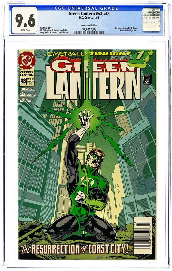 Newsstand Edition. Emerald Twilight: Part 1 of 3. "The Past!" Story by Ron Marz. Art by Bill Willingham, Robert Campanella, and Romeo Tanghal. It's the beginning of the end for Hal Jordan. In this seminal chapter in the life of Green Lantern, Hal returns to ground zero and attempts to use his Power Ring to resurrect the devastated Coast City. But what happens if he doesn't have enough power? Don't miss the most unexpected turn in the life of Hal Jordan as DC counts down to a very special 50th issue. NOTE: 1st appearance of Kyle Rayner. Cover price $1.50. Grade: CGC 9.6 explanation of grade Condition: Used (collectible)