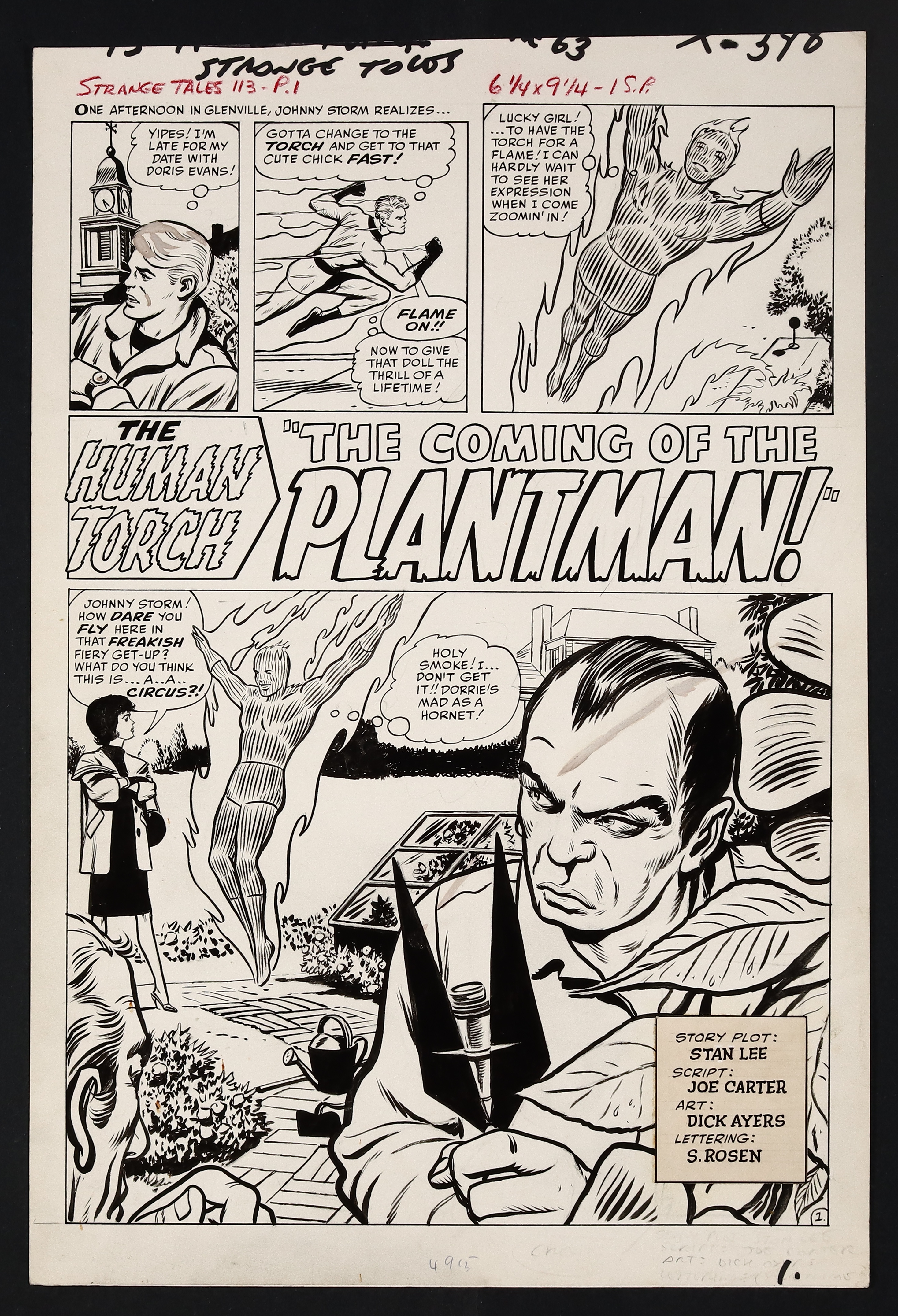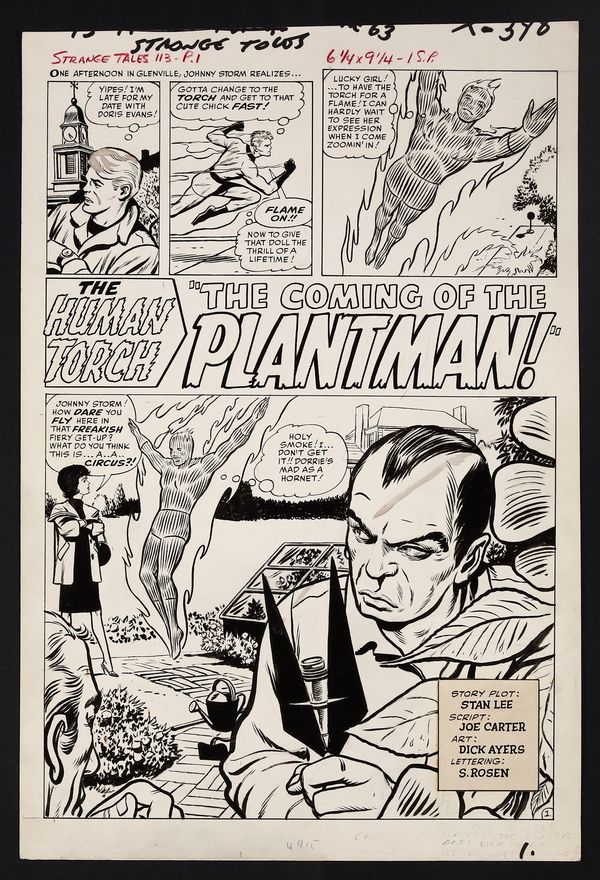 Face front True Believers, it's time for a Johnny Storm solo adventure! There's a lot to love about this title pages, from the magnificent opening three-panel sequence of Johnny springing into action to the beautiful hand-drawn title logo to the dramatic half-splash panel focusing on the villainous Plantman! This page features the first appearances of both Plantman and Dorrie Evans the on-again/off-again girlfriend of the Human Torch, two characters who are still showing up in comics today! Included with the art is a copy of the published issue, as well as a copies of the characters' most recent comics appearances- Marvels Snapshots Fantastic Four #1, a story about Johnny's 10 year high school reunion that stars Dorrie and a copy of Empyre: Avengers #2 from 2020 which sees Plantman joining with the plant-based extraterrestrials known as the Cotati in their attempted invasion of earth! Pencil and ink on art board. 13 3/4" x 20 1/2".