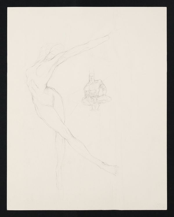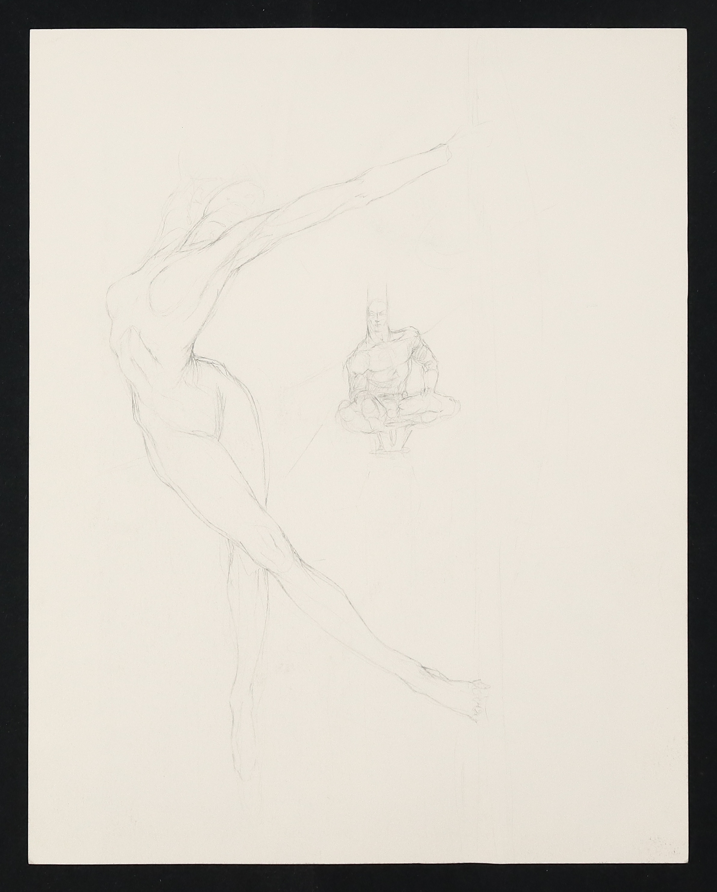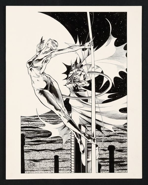 Known primarily for his painted work, Gröss turns in a brilliant pencil and ink pinup here. The composition of the piece is stunning with Batman's McFarlane-esque cape in the background almost dancing with Catwoman in the foreground where she's framed within the moon. Another great touch here is the subtle smirk on Batman's face- an expression the Dark Knight doesn't make too often! Signed by the artist. Pencil and ink on art board. 11" x 14".