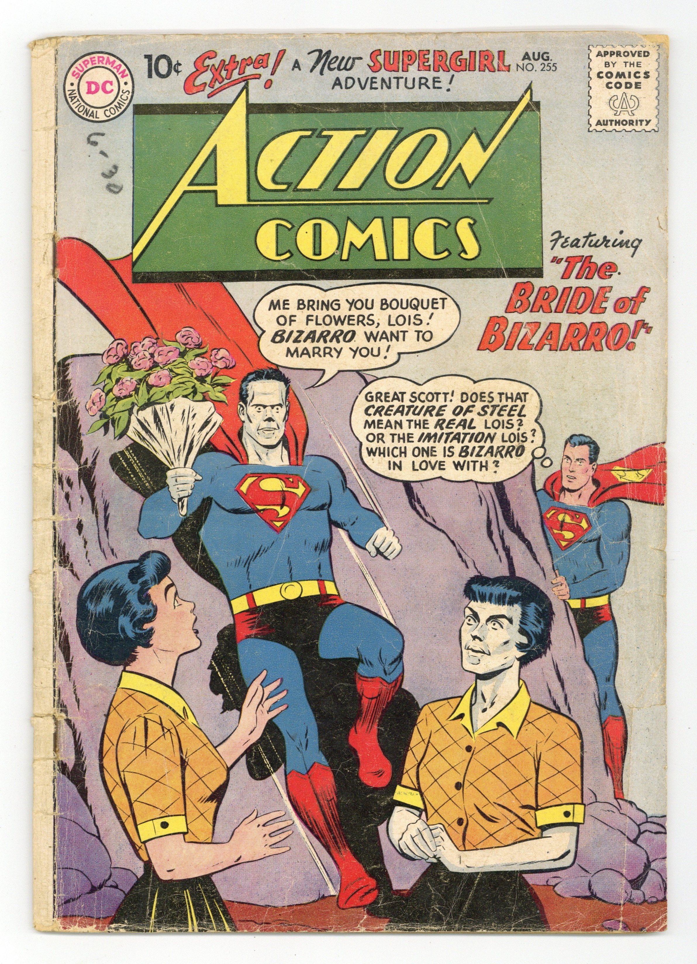 Ended Jun 30 2025 Winning Bid $28 Cover pencils by Curt Swan, inks by Stan Kaye. 1st appearance of Bizarro Lois Lane (cover & story) in "The Bride of Bizarro!", script by Otto Binder, art by Al Plastino; Bizarro keeps the real Superman from revealing to Lois that she has been proposed to by Bizarro's duplicate, whom he calls New Bizarro, with a kryptonite meteorite, but Lois realizes New Bizarro is not the true Man of Steel; The New Bizarro doesn't give up easily, and the duplicates fight each other. "The Abominable Snowman!", script by Robert Bernstein, art by Howard Sherman; Congo Bill vs. The Abominable Snowman. Half-page Jerry the Jitterbug story by Henry Boltinoff. "Supergirl Visits the 21st Century!", script by Otto Binder, art by Jim Mooney; Supergirl takes her first flight across the time-barrier from 1959 into the future, about a hundred years; hence, she secretly observes a brilliant young orphan named Tommy on an asteroid orphanage. 36 Pages, Full Color. Cover price $0.10. Grade: GD- 1.8 explanation of grade Condition: Used (collectible)
