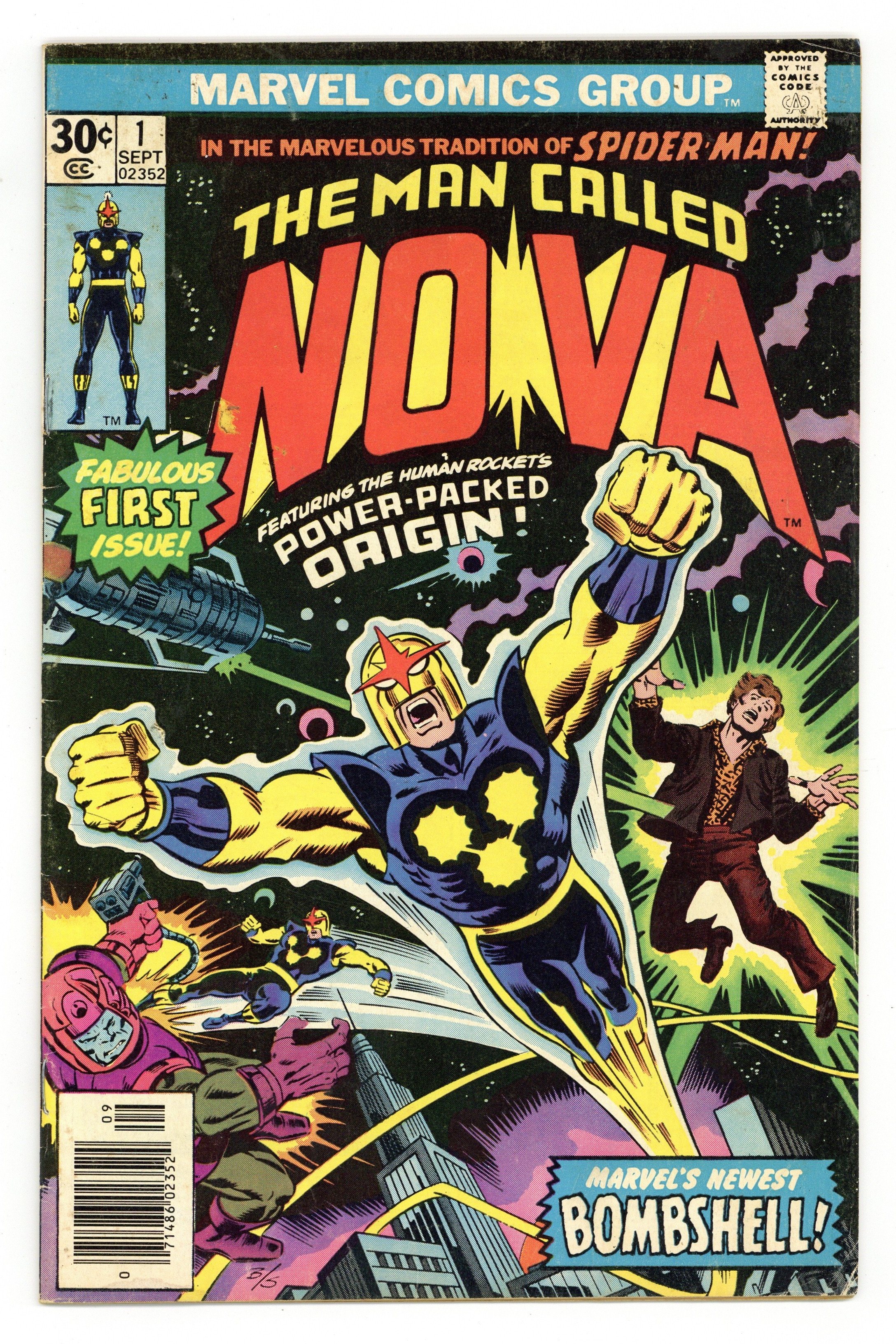 Starts Dec 8 Written by Marv Wolfman. Pencils by John Buscema. Inks Joe Sinnott. When a dying alien passes on his super-powers to Earth teenager Richard Rider, Rider becomes the man called Nova, the human rocket! In the marvelous tradition of Spider-man, Nova must now stop the murderous alien known as Zorr, or Earth is doomed! Note: First appearance of Nova. 36 pages, full color. Cover price $0.30. Grade: GD/VG 3.0 explanation of grade Condition: Used (collectible)